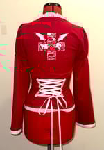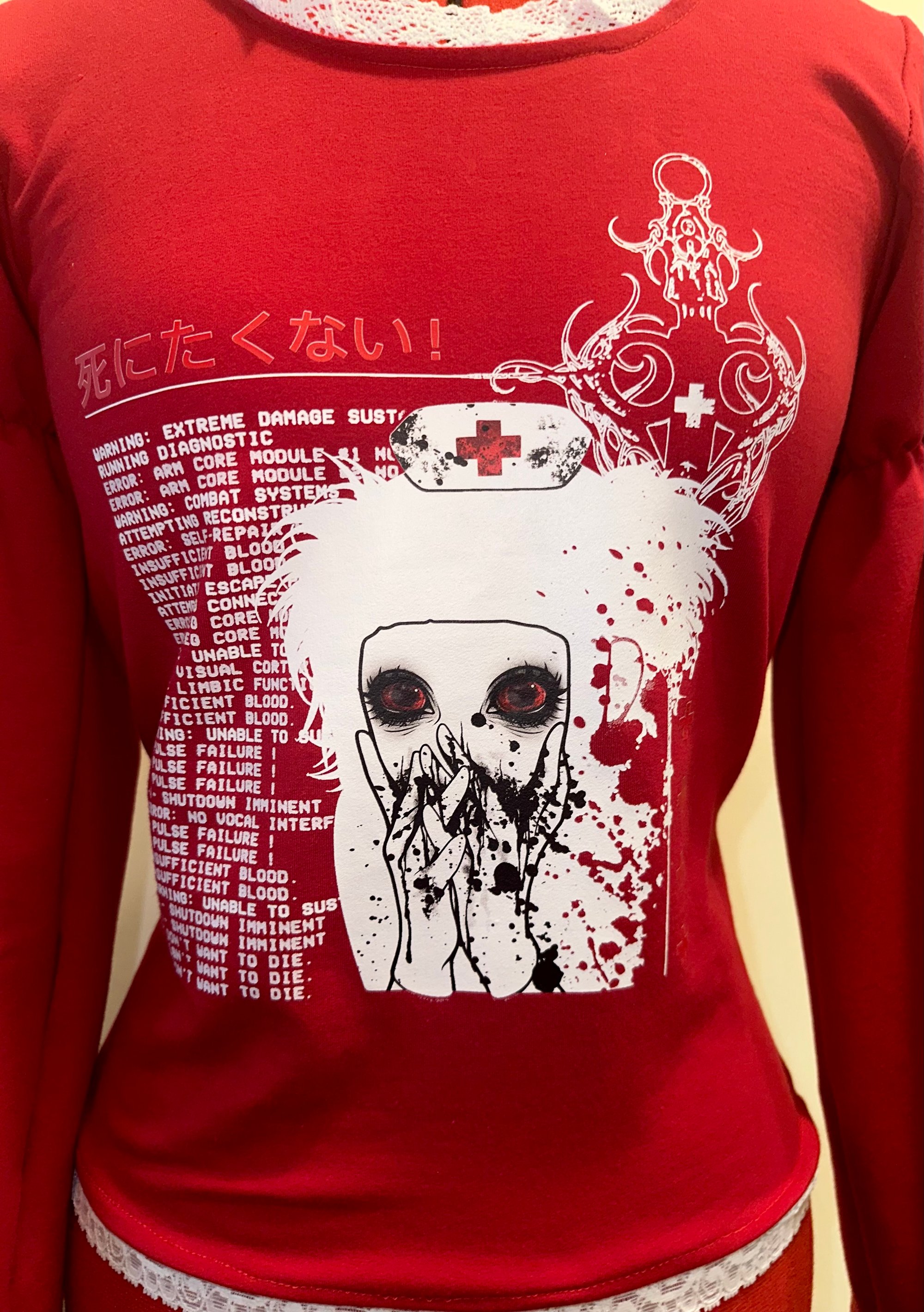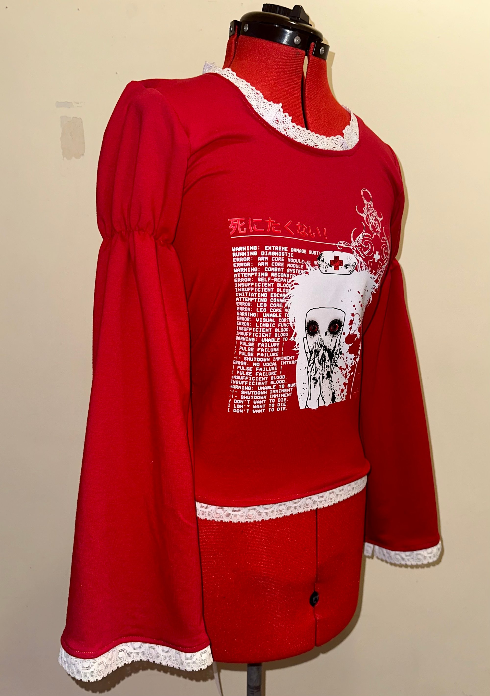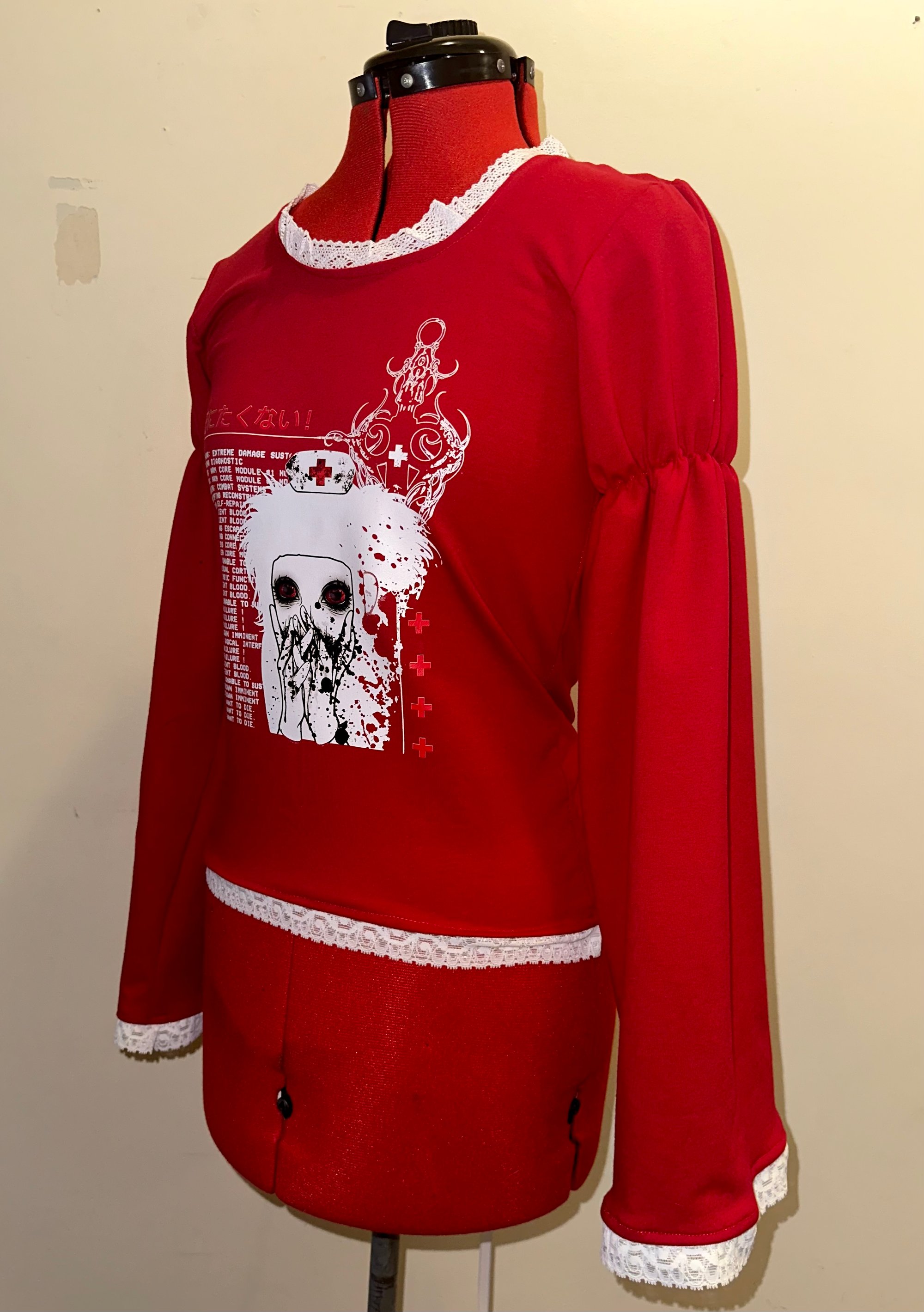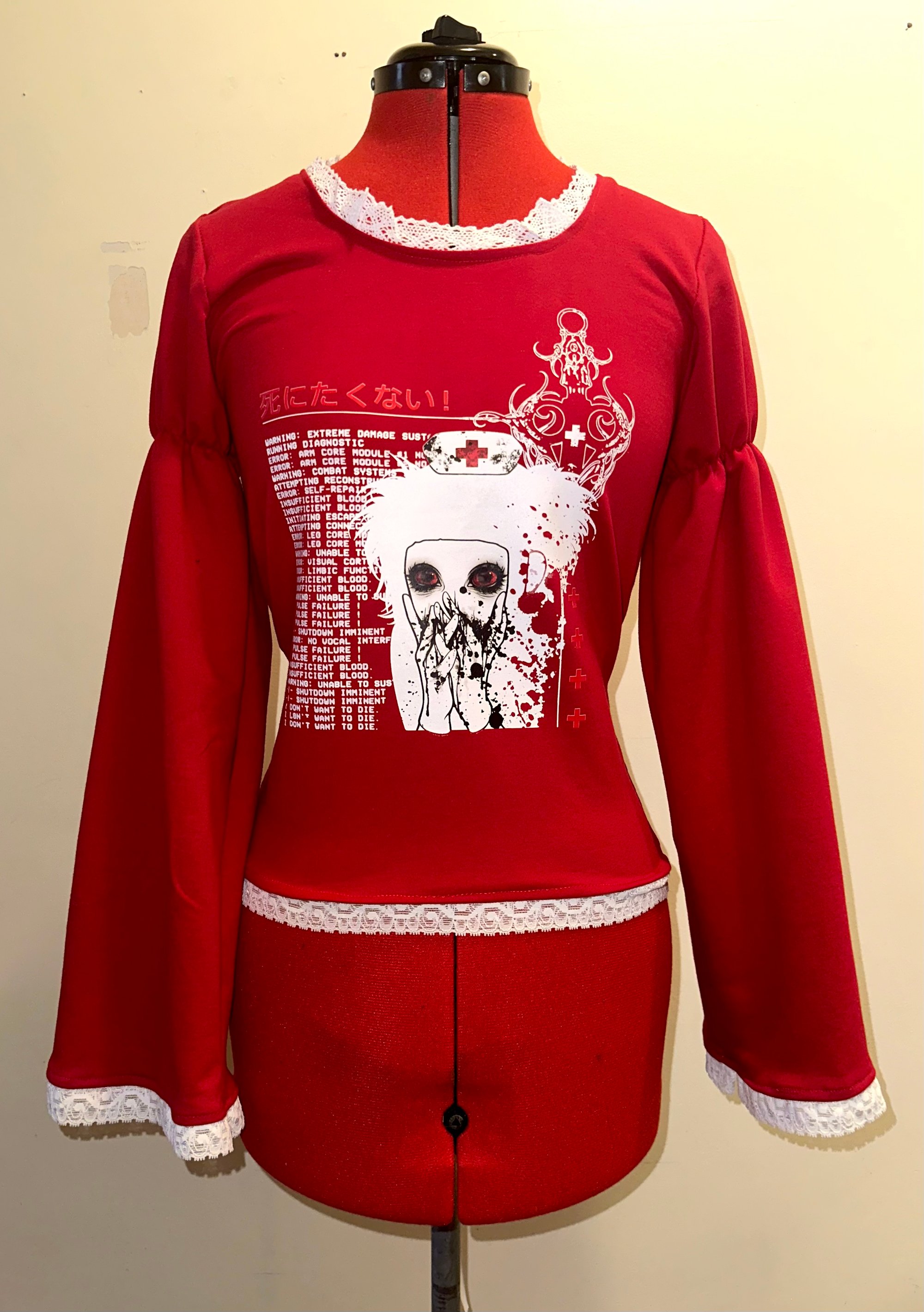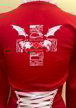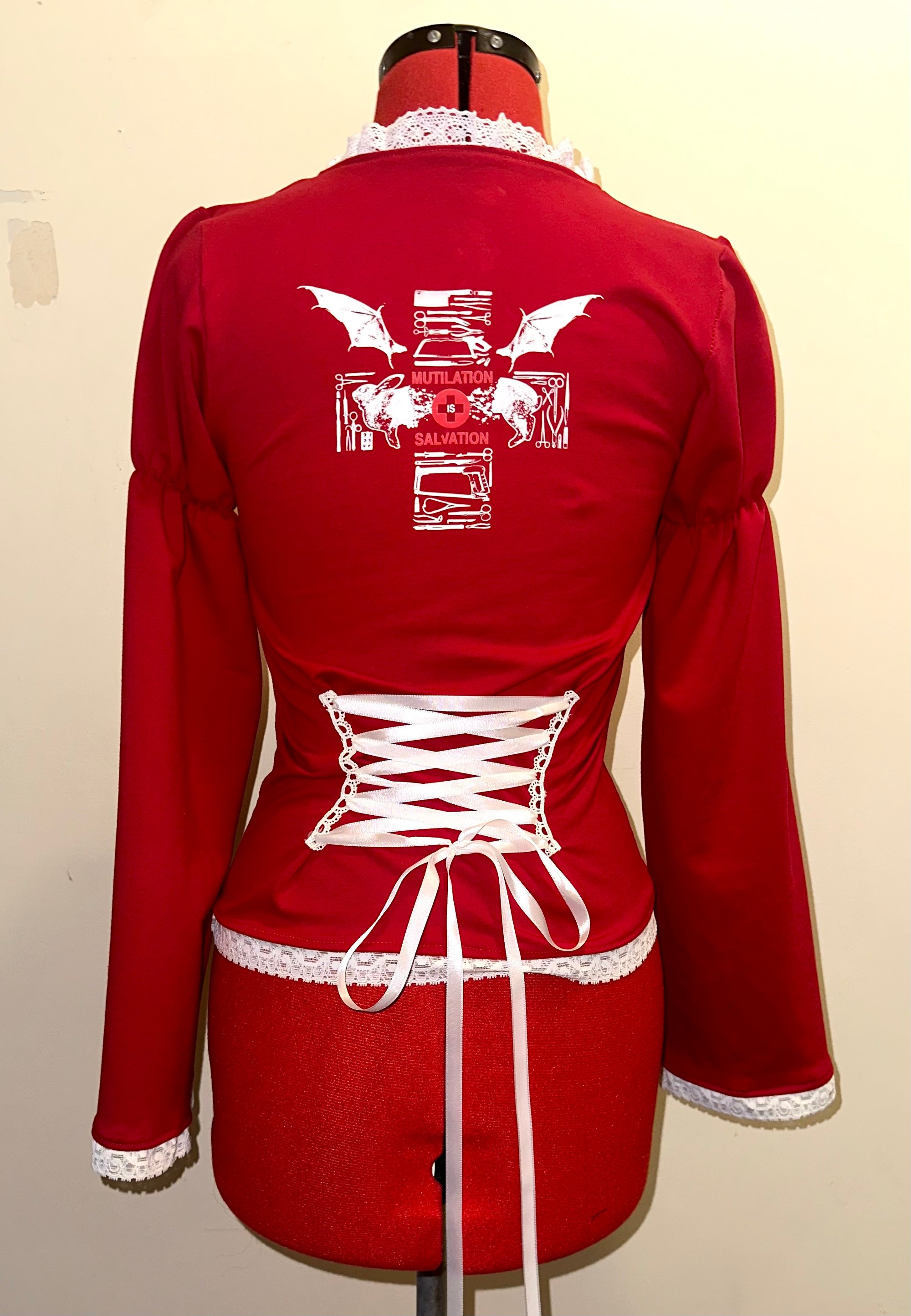 long sleeve cutsew made from cotton red knit jersey & white lace, featuring original graphics by @crucifx0n.me on IG. includes corset lacing in the back.