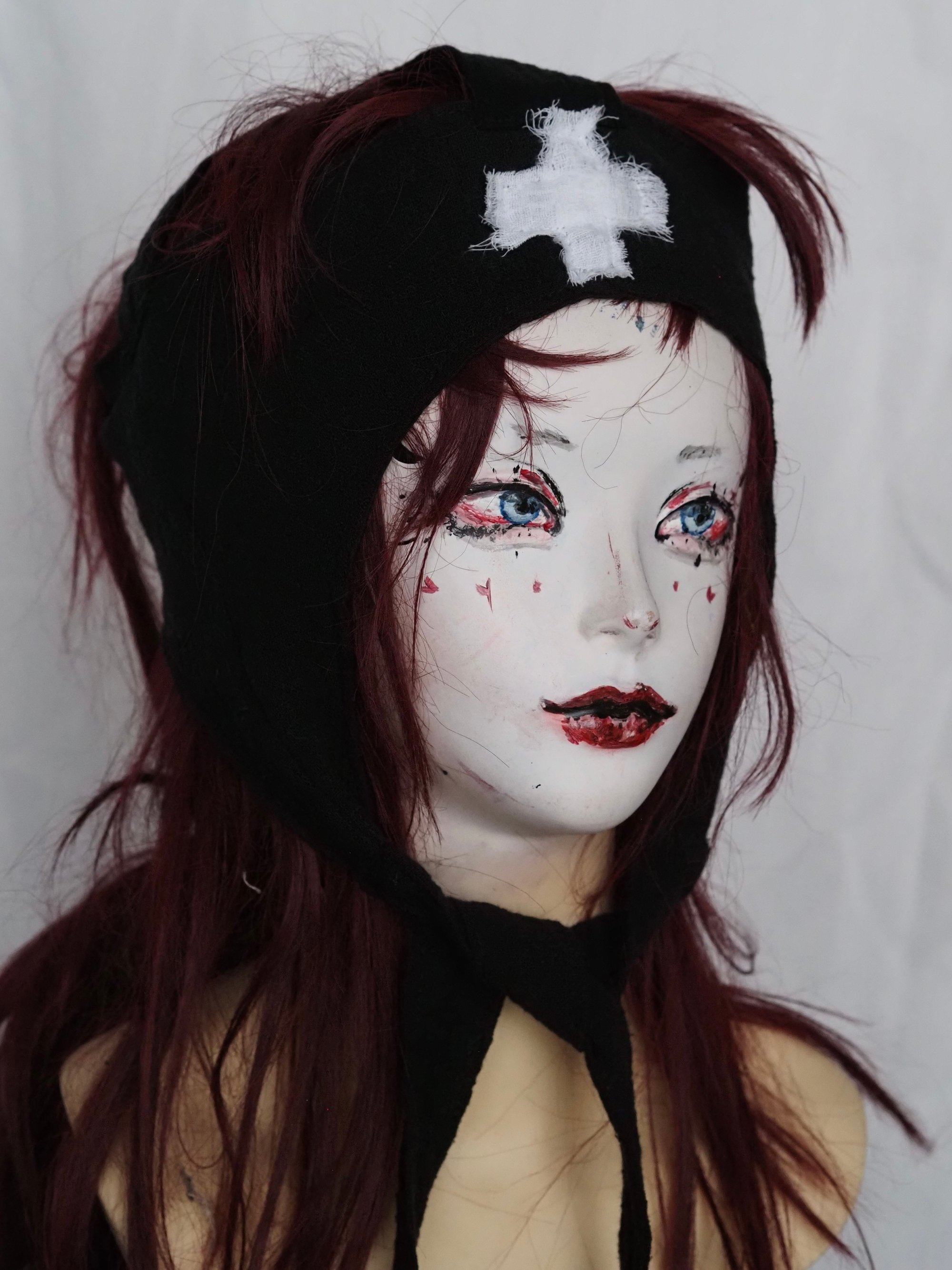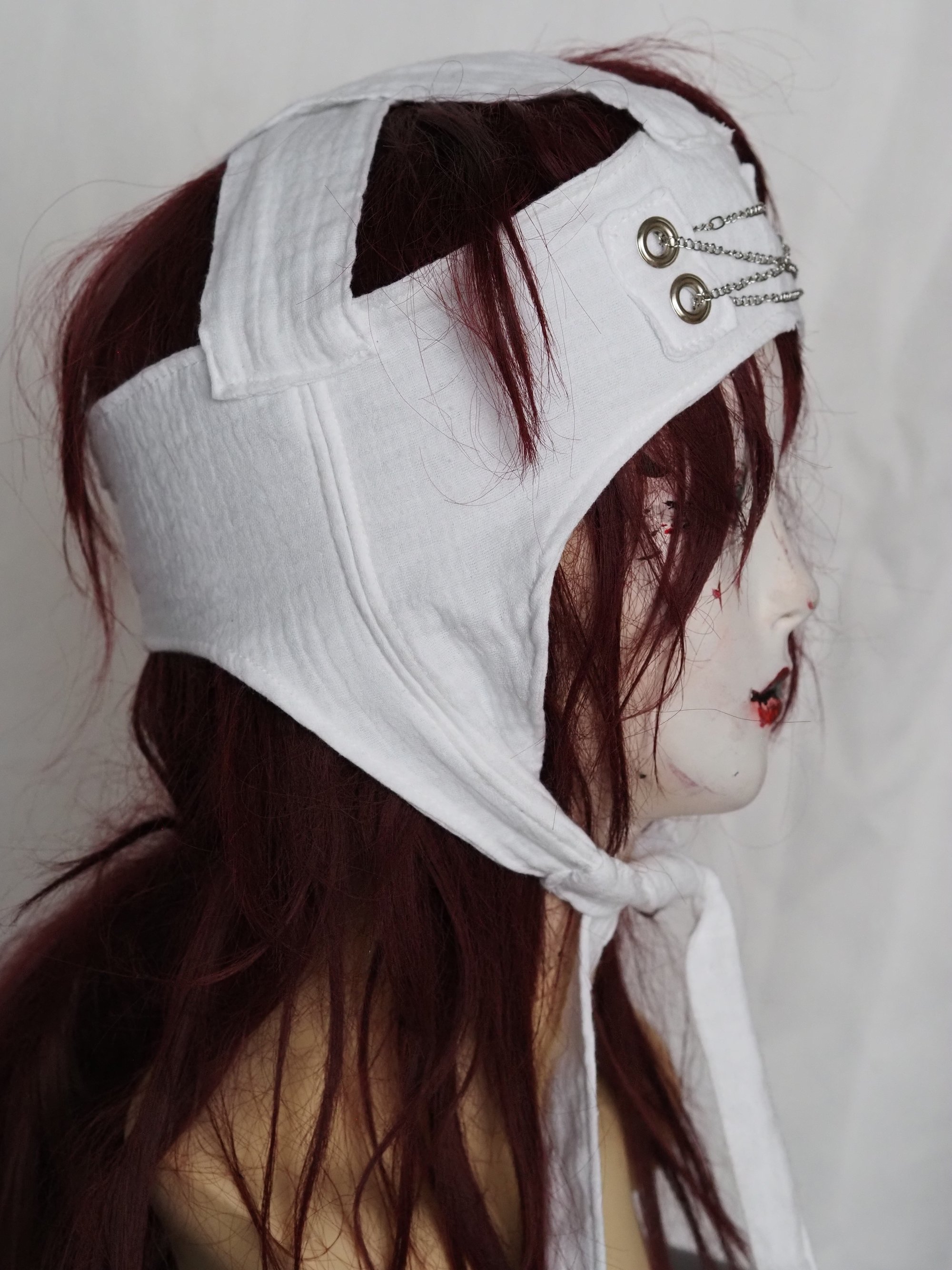 cotton gauze bondage hats from the sample collection of "angel autopsy," in collaboration with art by @crucifx0n.me
