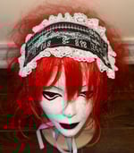 headdress made with black pleather fabric and white lace, featuring original graphic by @crucifx0n.me on IG. includes ribbon to tie underneath