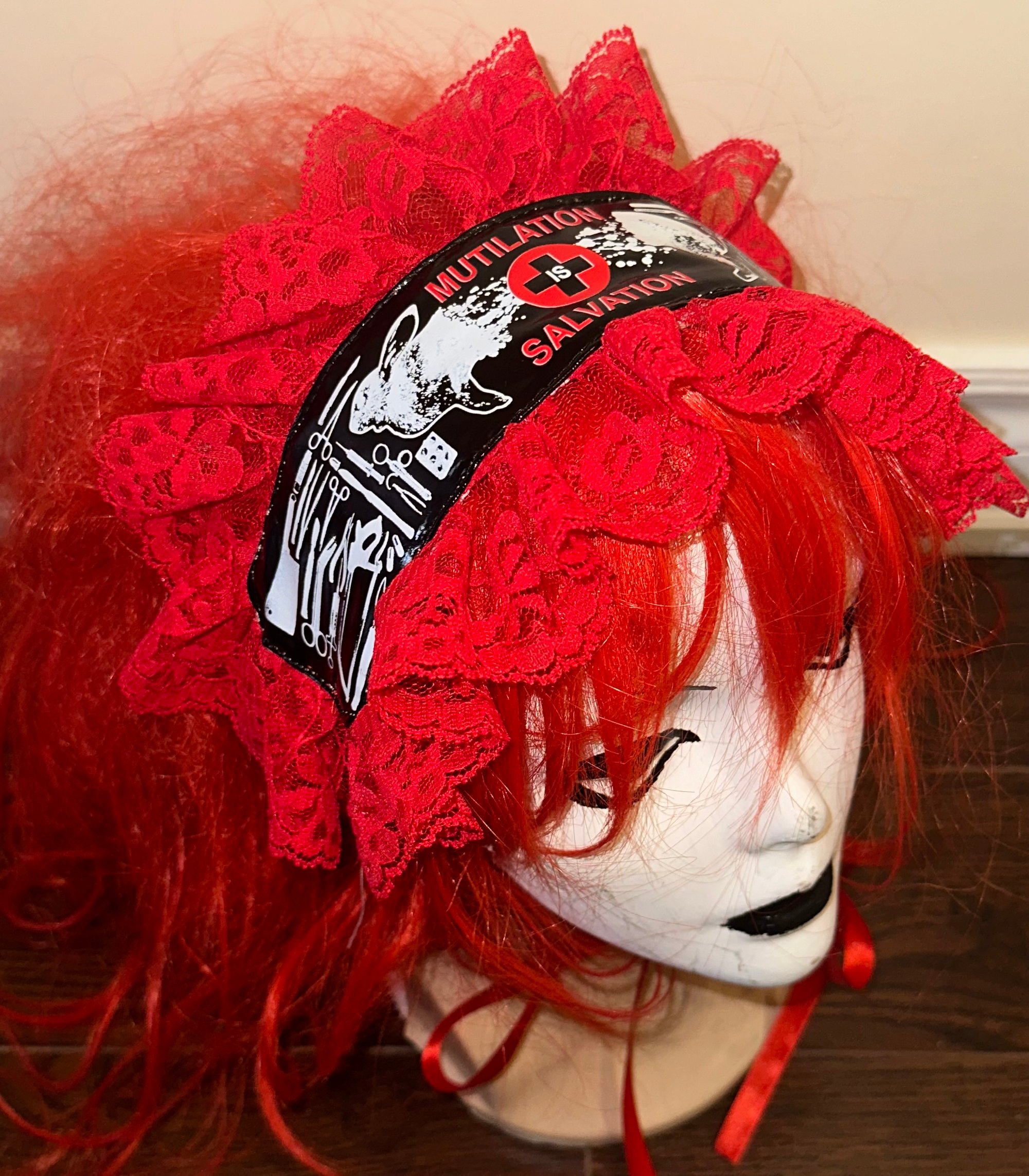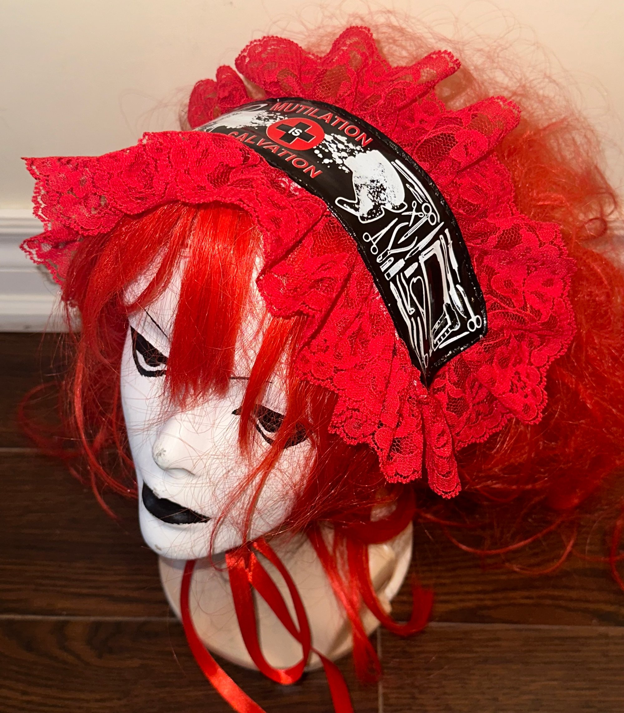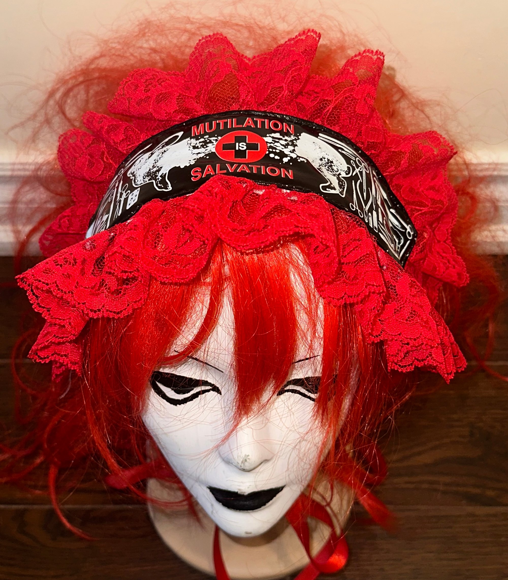 angel autopsy “mutilation is salvation” headdress (black x red)