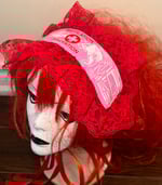 headdress made with pink PVC fabric and red lace, featuring original graphic by @crucifx0n.me on IG. includes ribbon to tie underneath