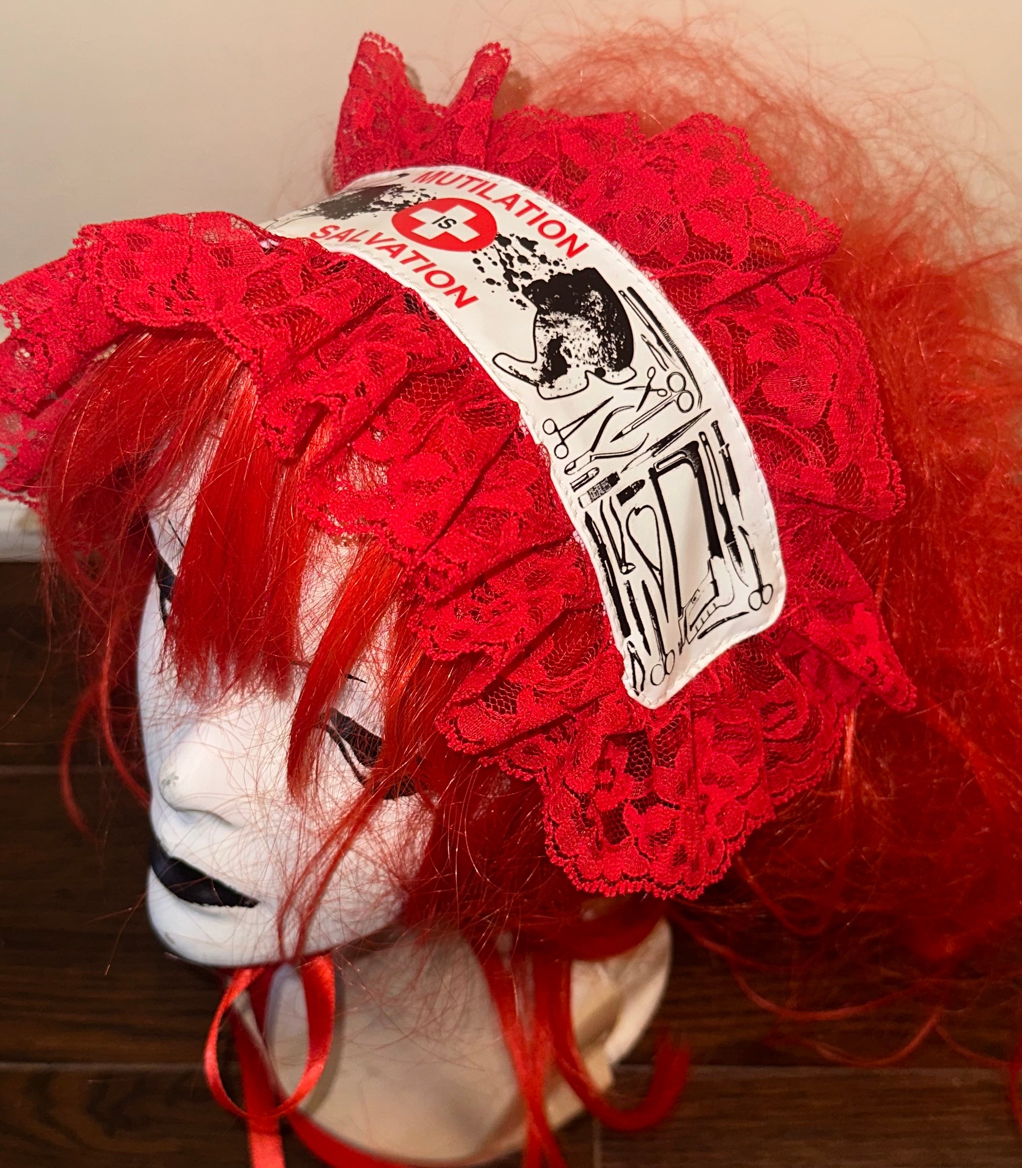 angel autopsy “mutilation is salvation” headdress (white x red)