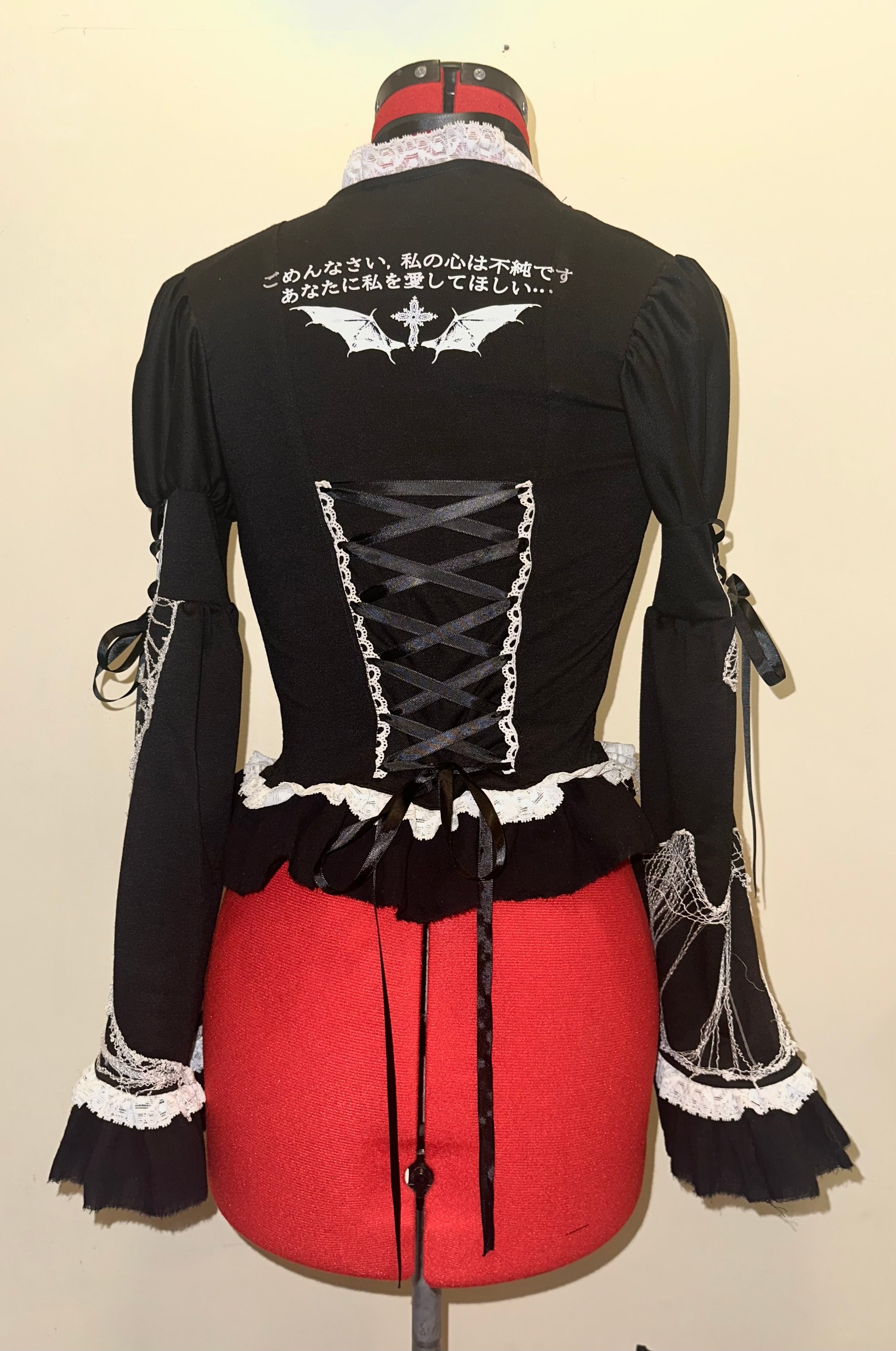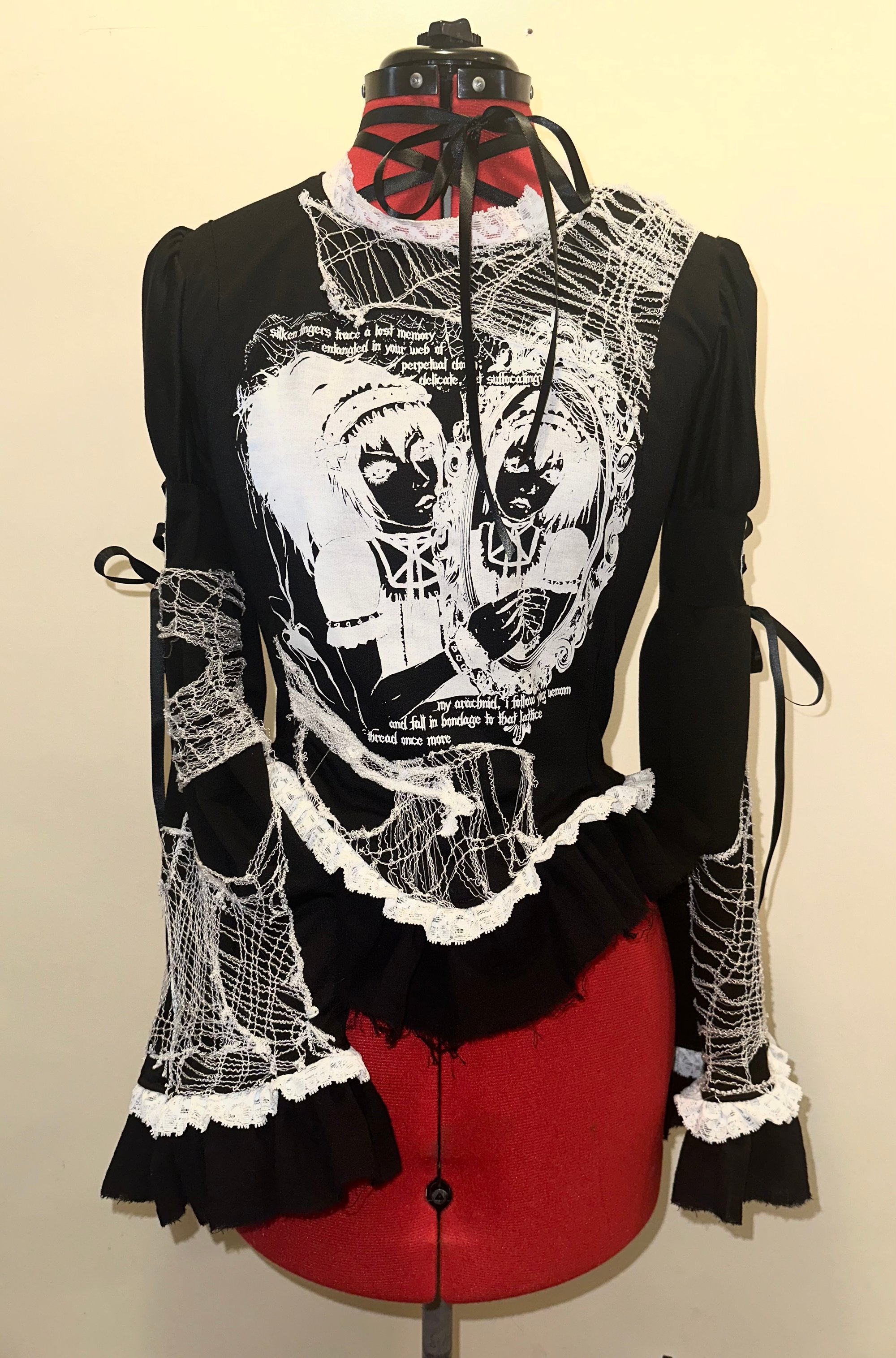 Corset-styled cutsew featuring long princess sleeves, ruffled lace, distressed details, and original “arachnid” print.