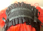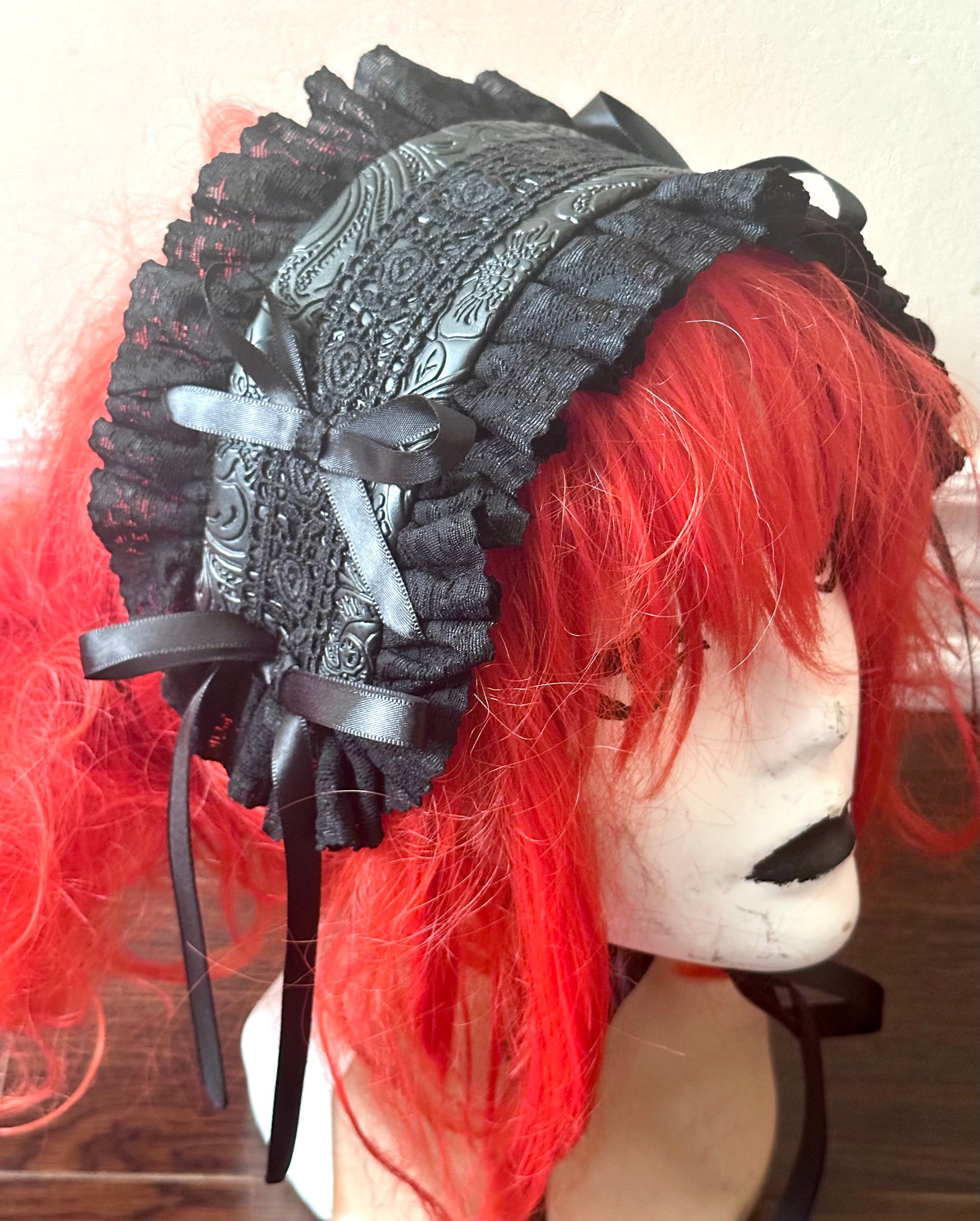 all-black pleather headdress with embossed designs, features lace and ribbon detailing