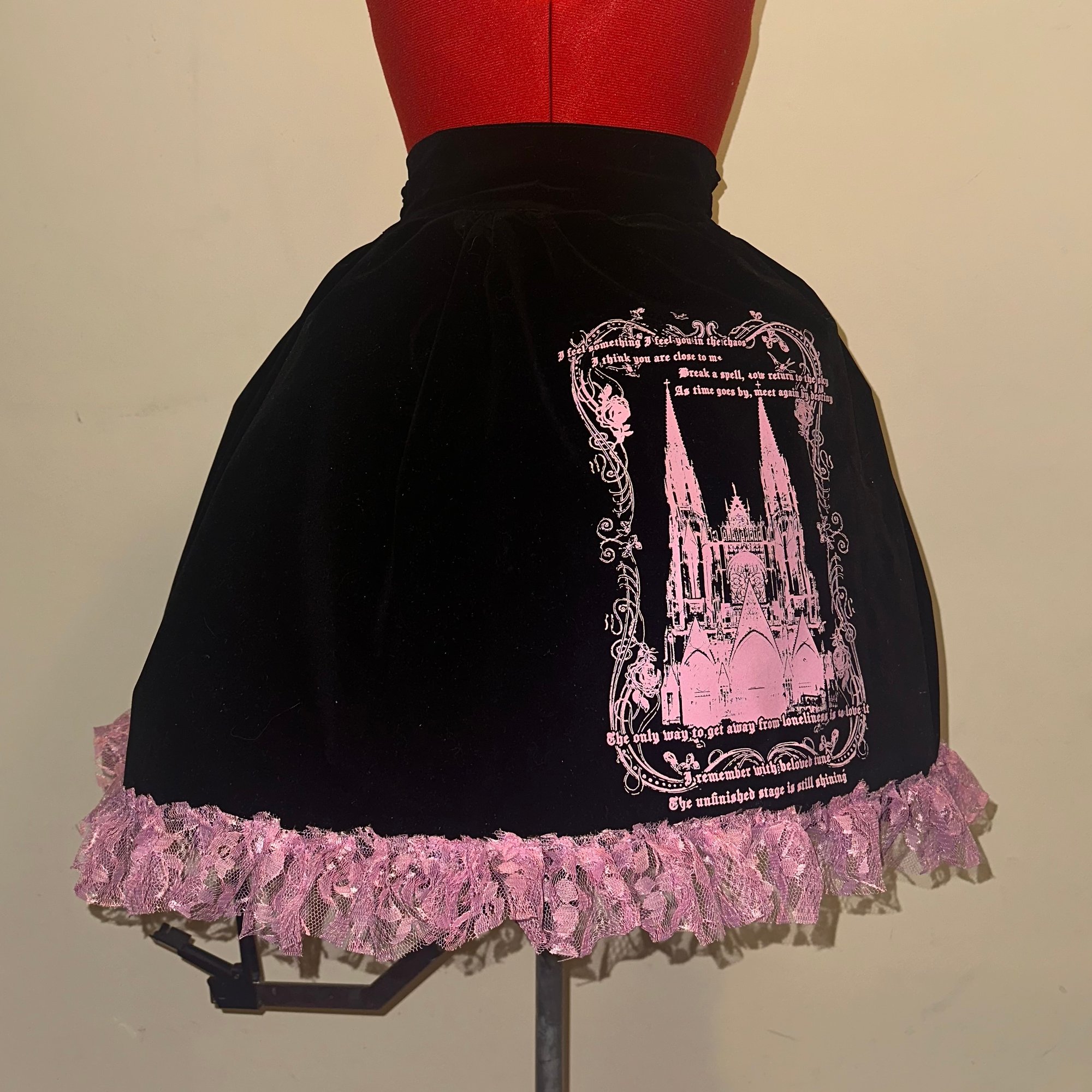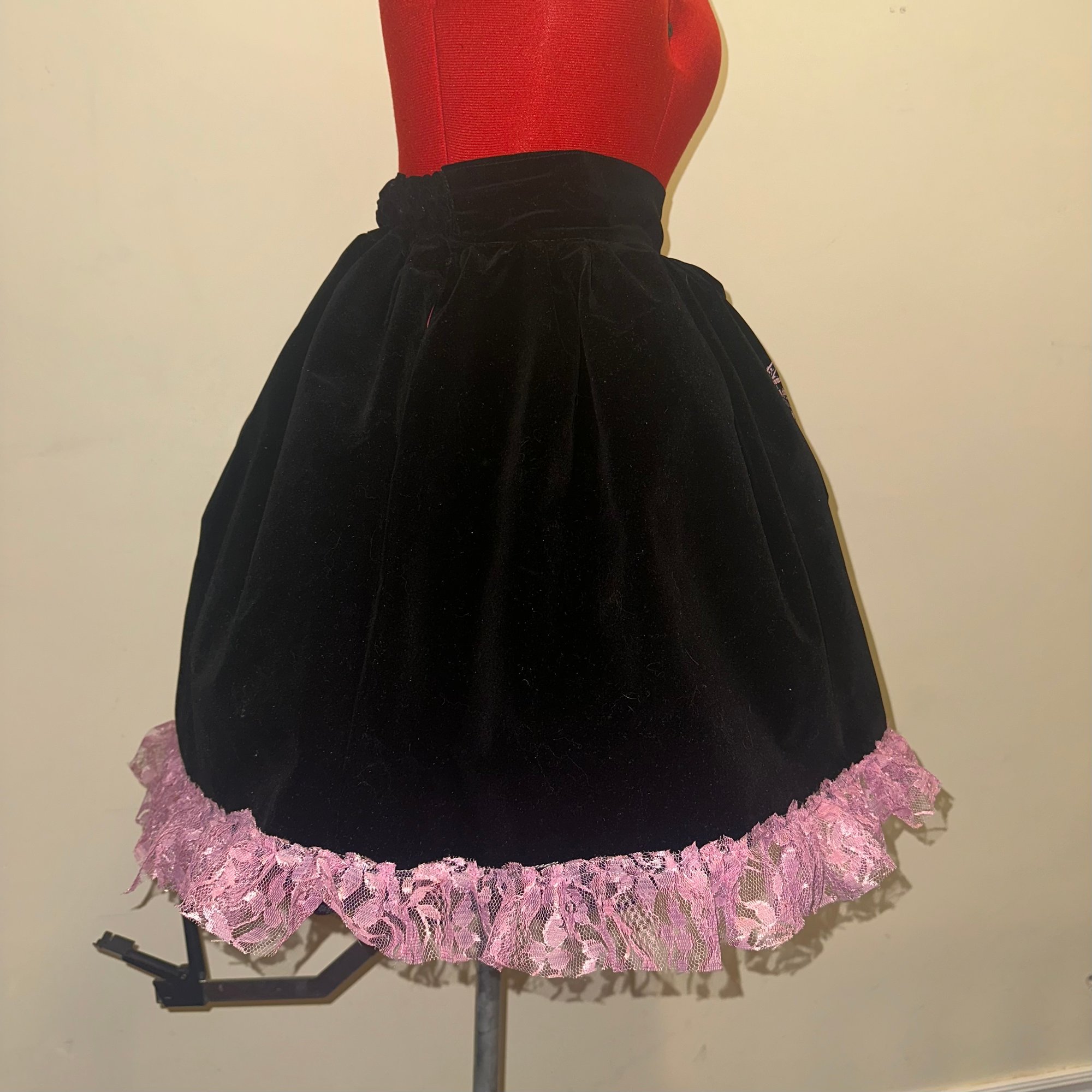 black velveteen skirt with back shirring, featuring pink lace, hidden side seam pockets, and original "monophobia" print design.