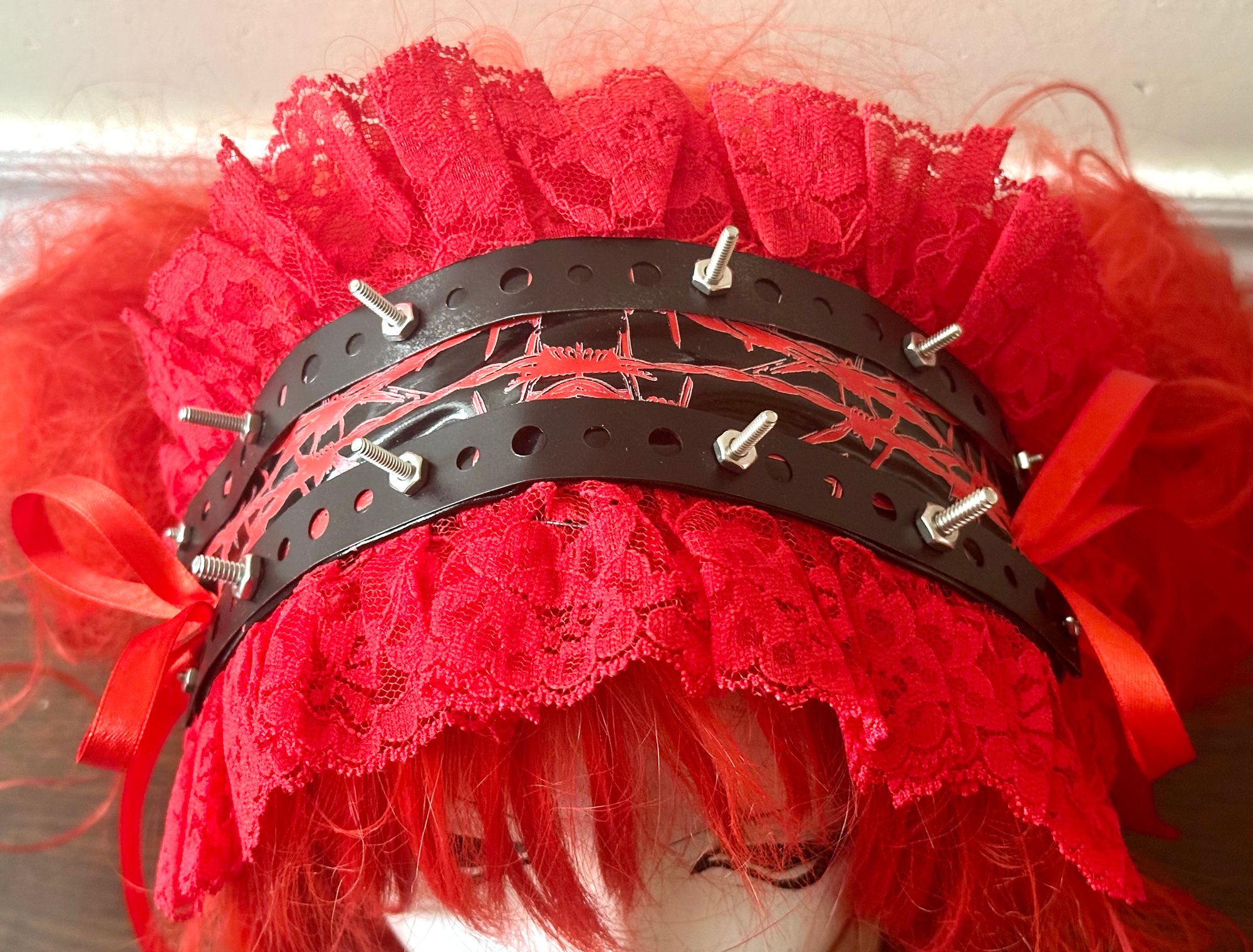 black pvc headdress structured with metal plumbers tape; features barbed wire graphic, screws, and lace detailing