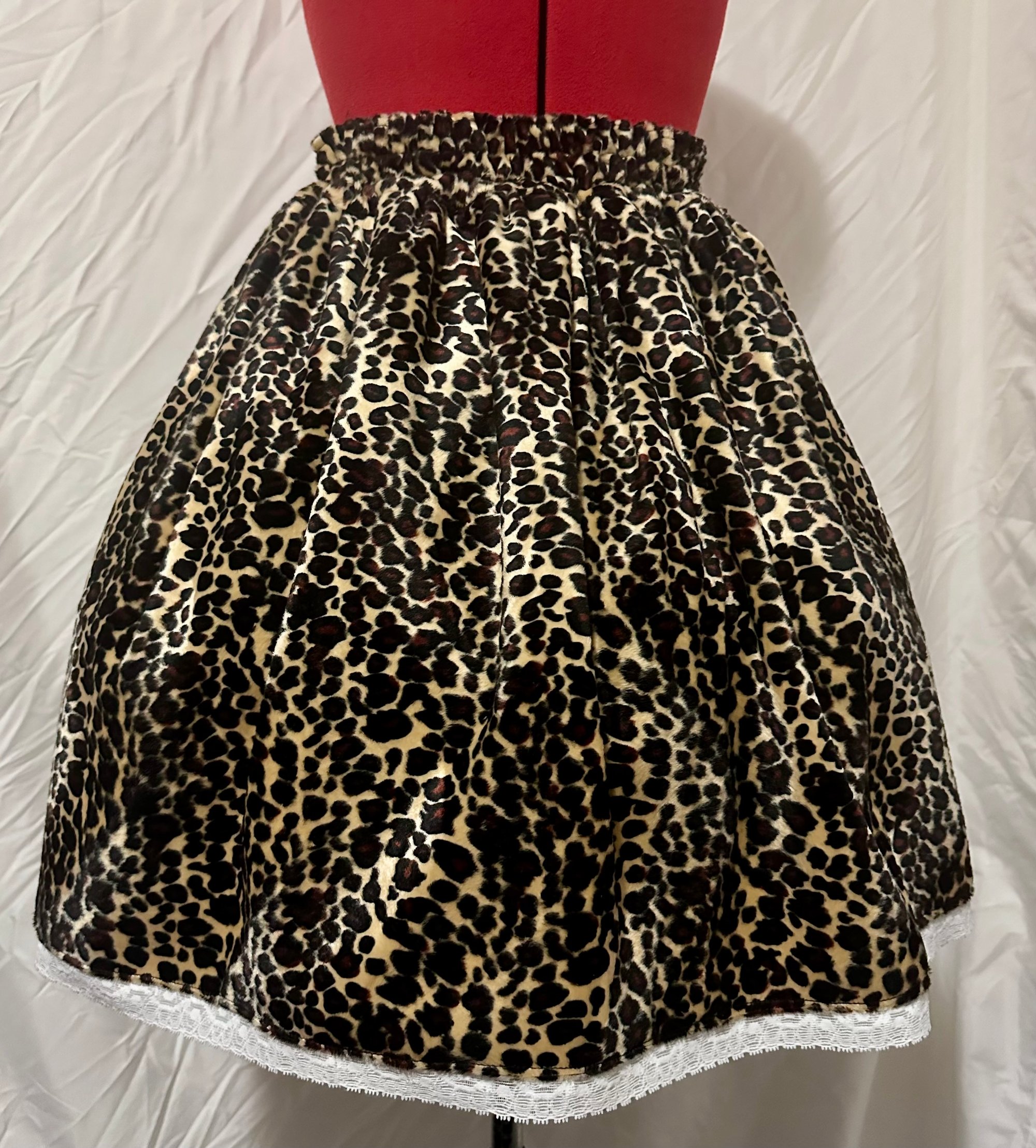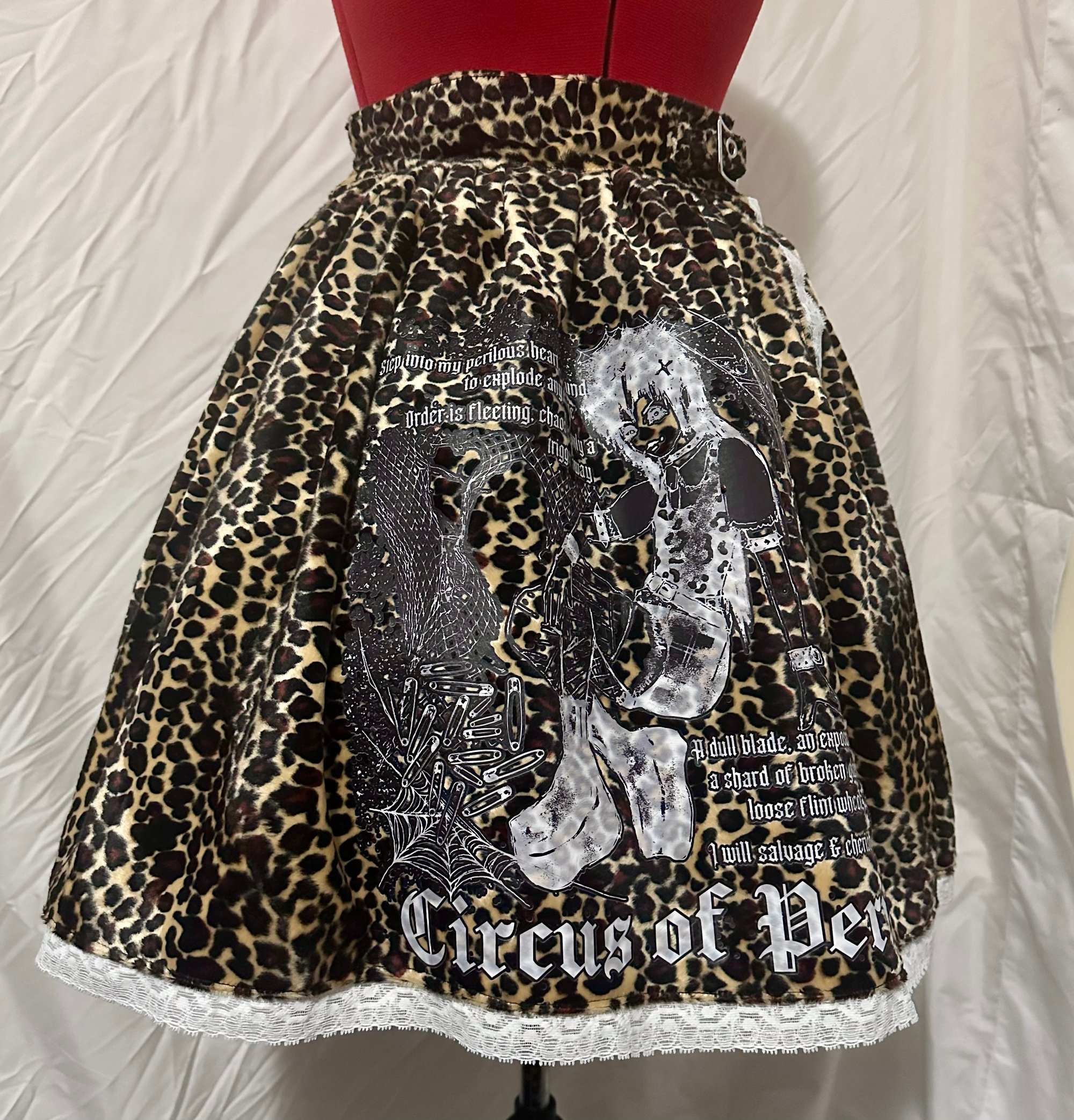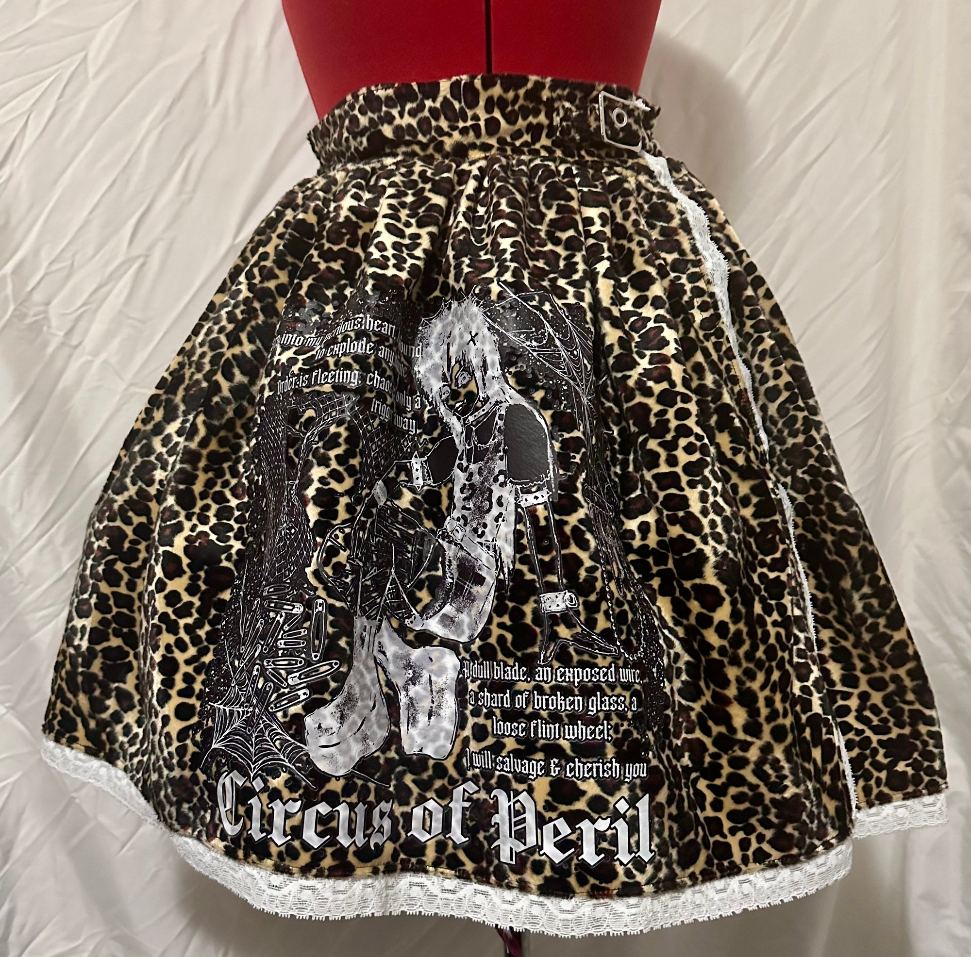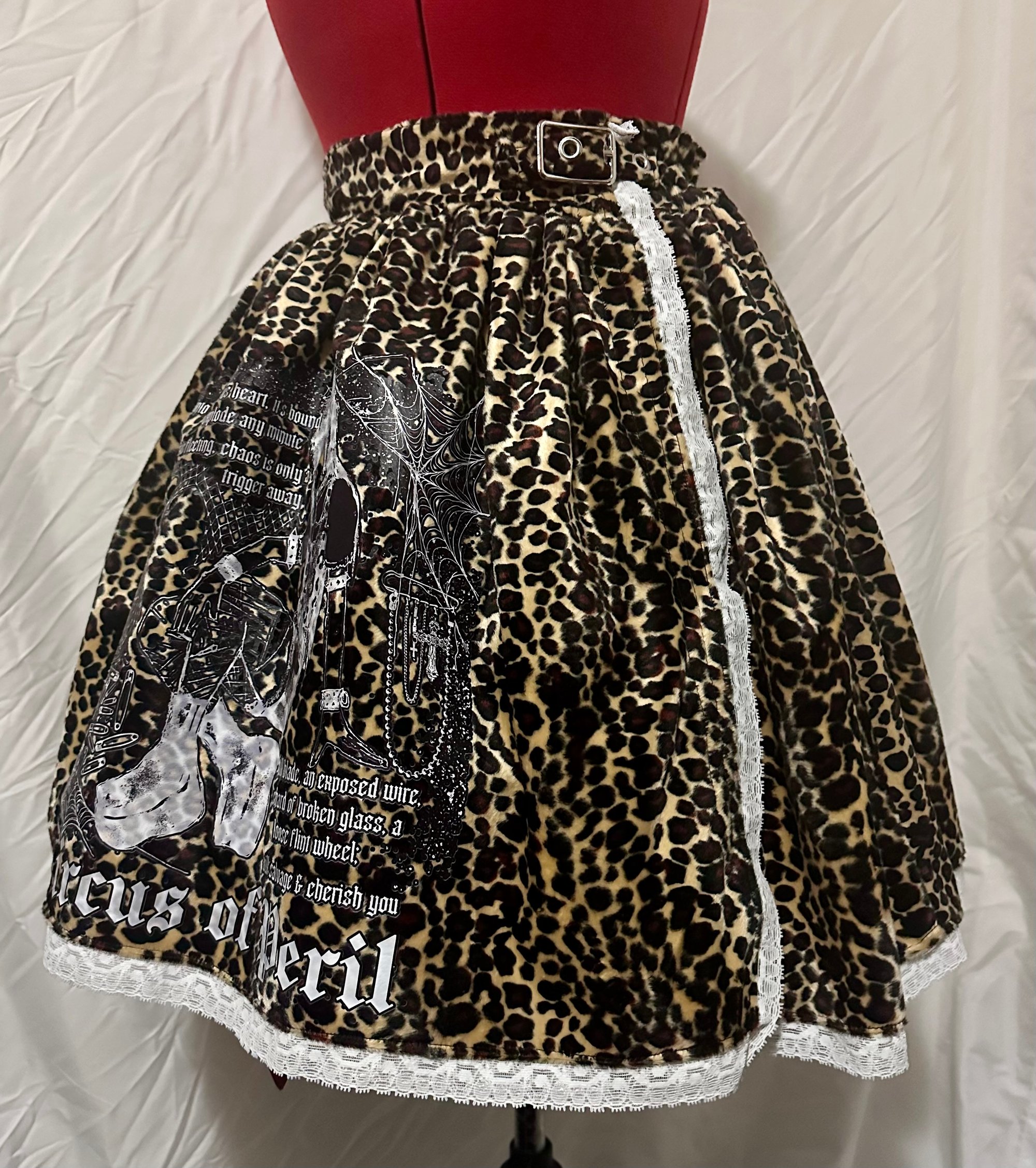 leopard skirt in a punky style with original perilous heart design, waist buckle, & hidden side buttons. includes back shirring.