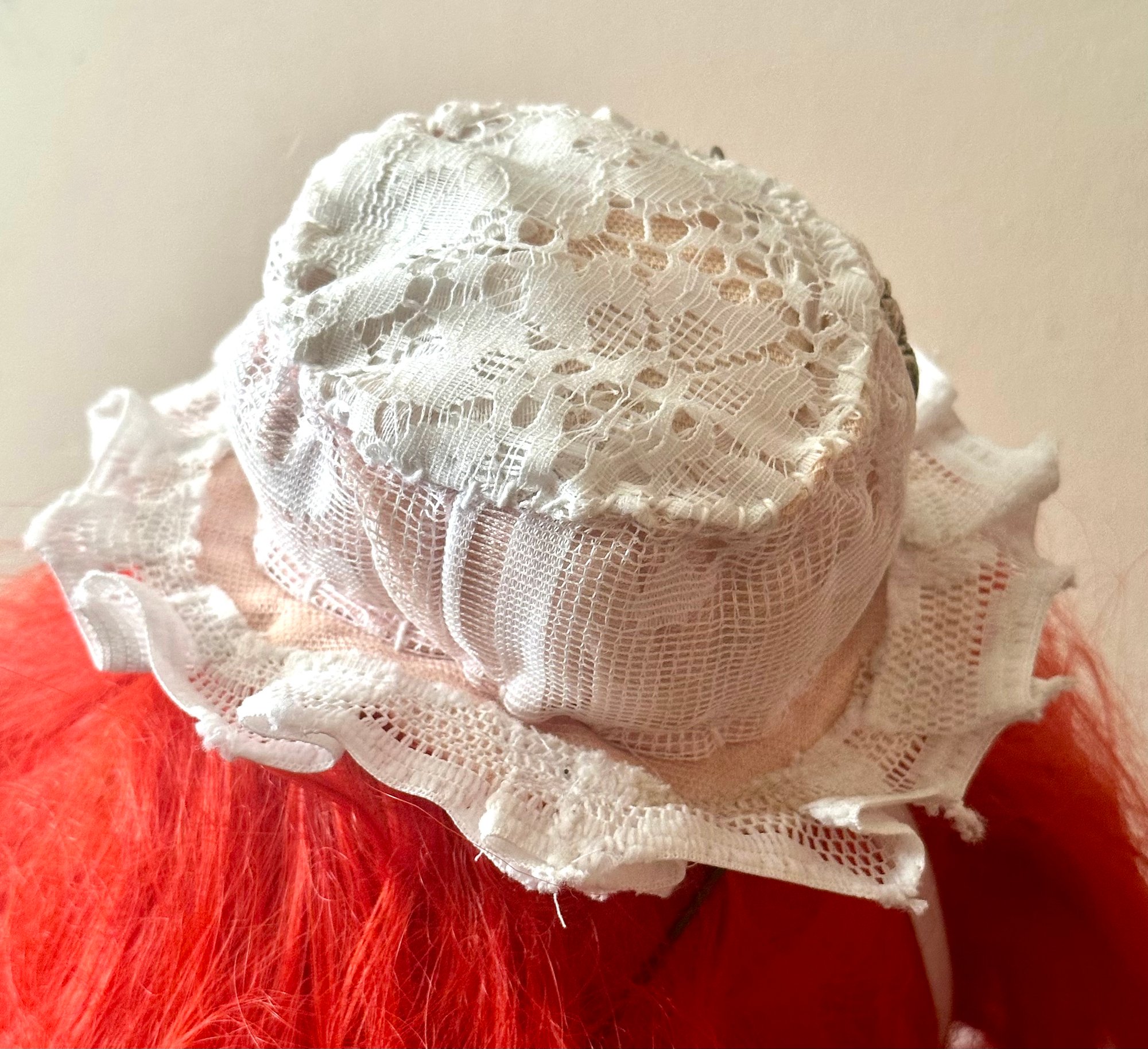 pink mini hat made from a variety of pink/lace fabrics and including some charms/chain. a little wonky :’3 discounting to clear up inventory!