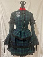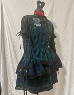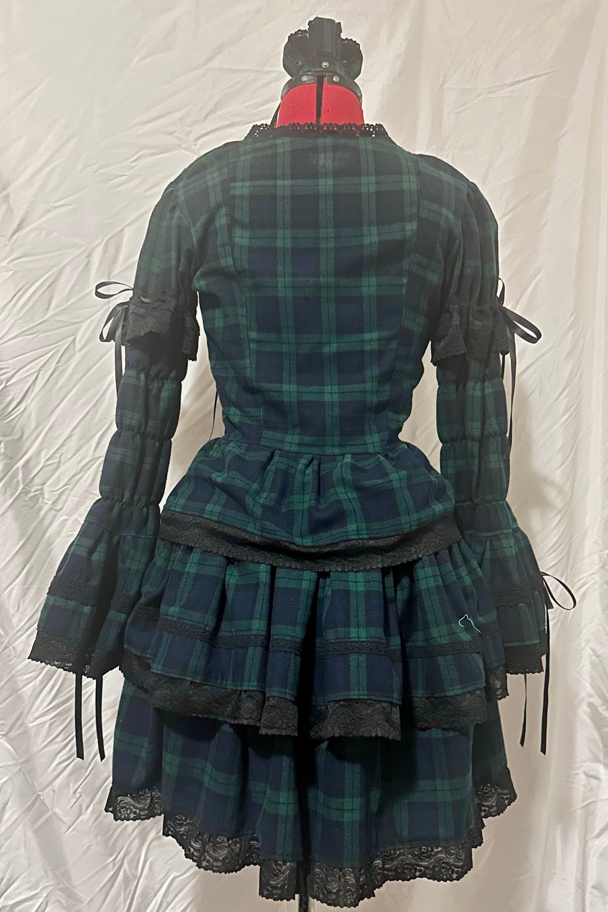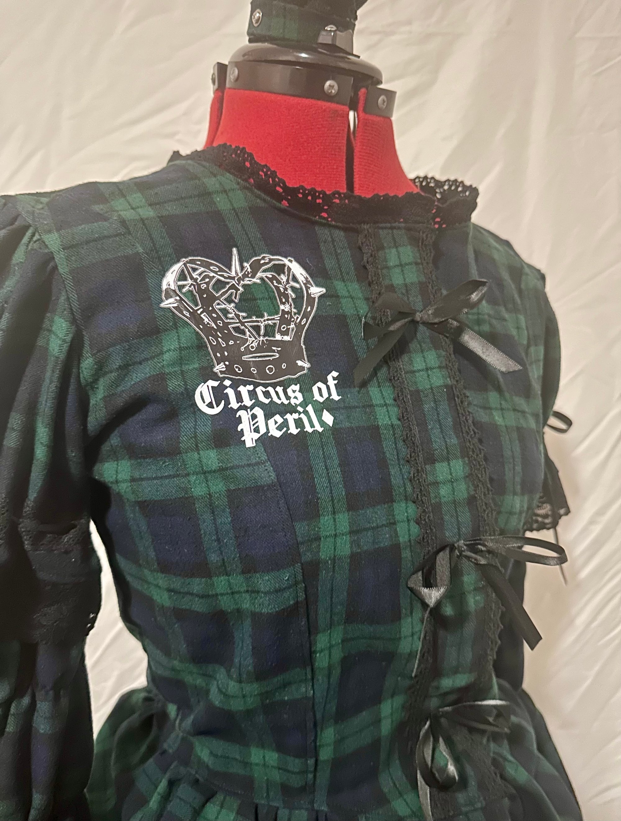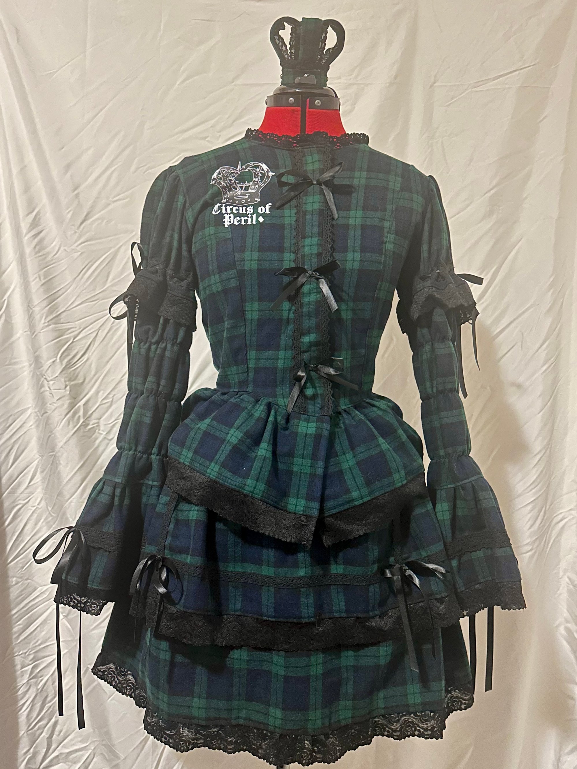 frilly 3-piece green/navy tartan set, includes: blouse (w/ detachable long sleeves), skirt, and crown. made with woven cotton fabric, a variety of black laces, and ribbon. features original “circus of peril” logo on the blouse.