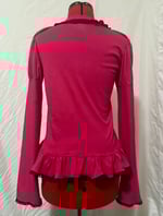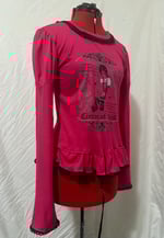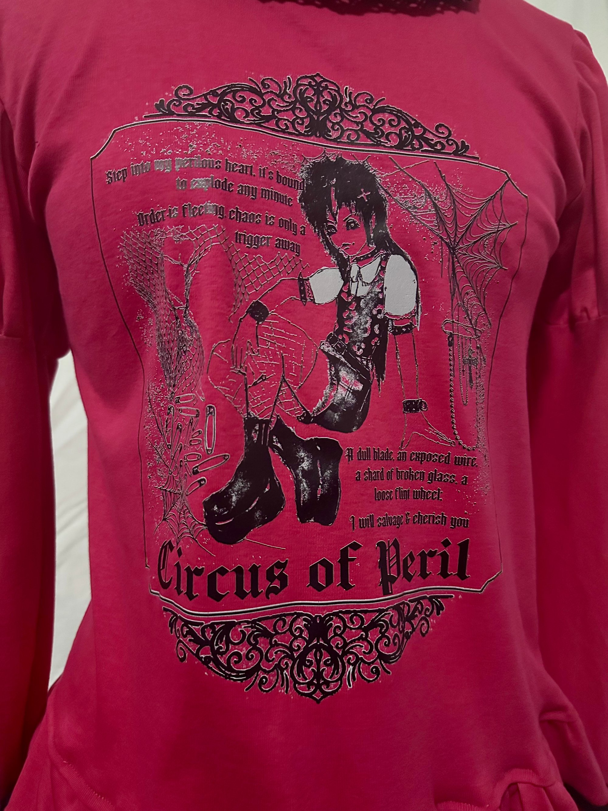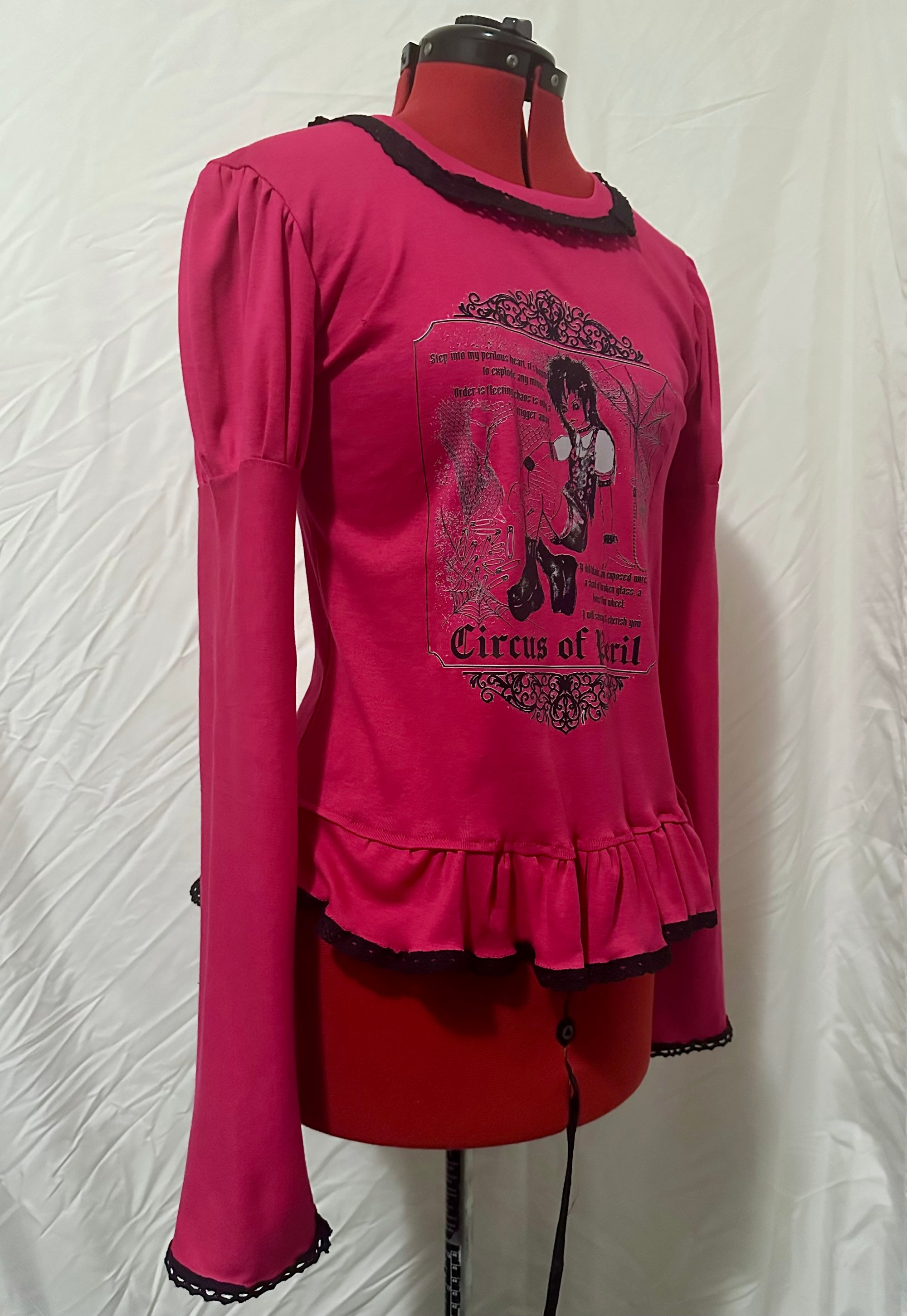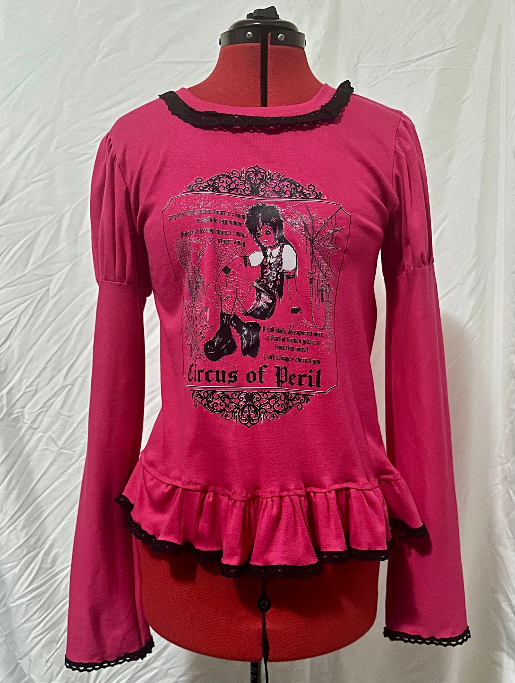 long sleeve cutsew made with lightweight hot pink cotton jersey fabric and black lace, featuring "perilous heart" print