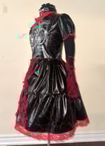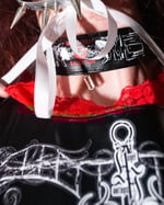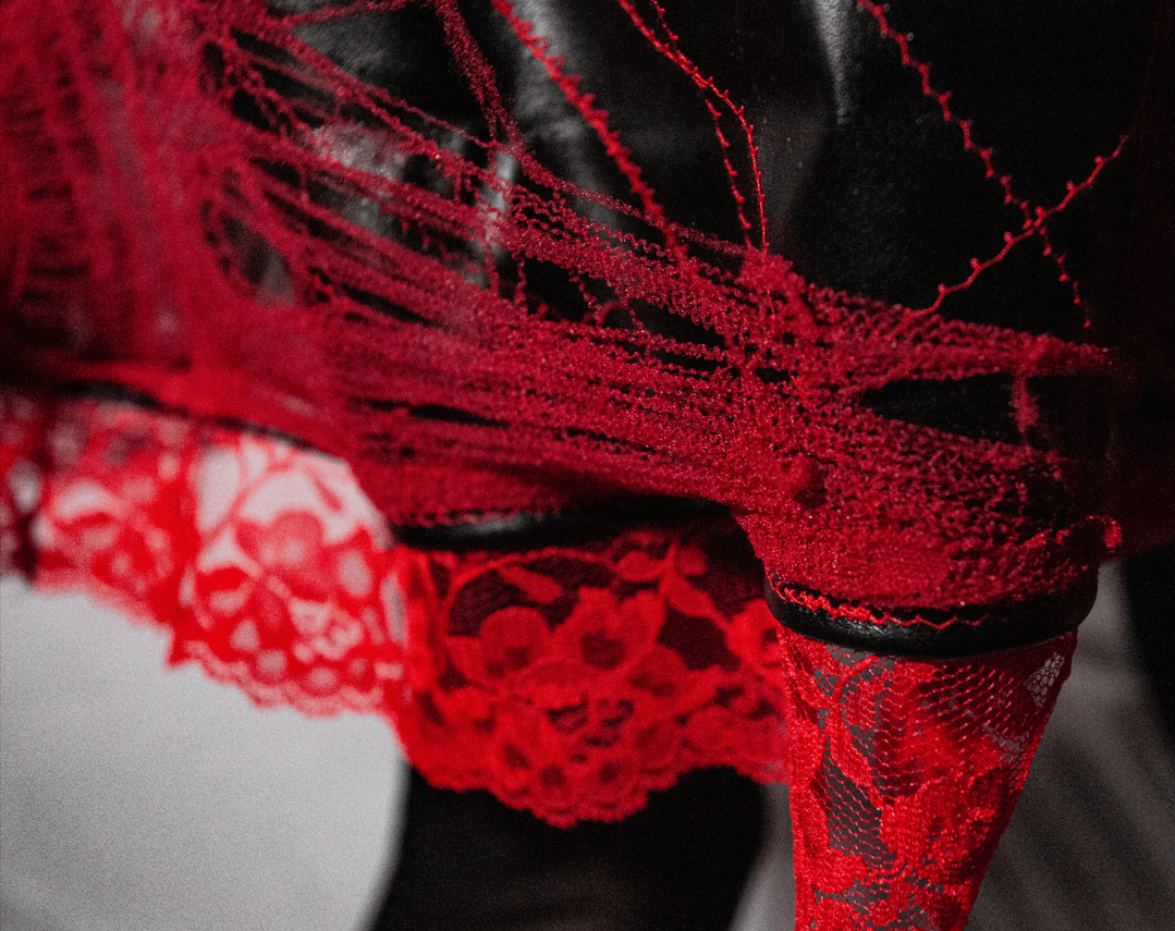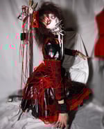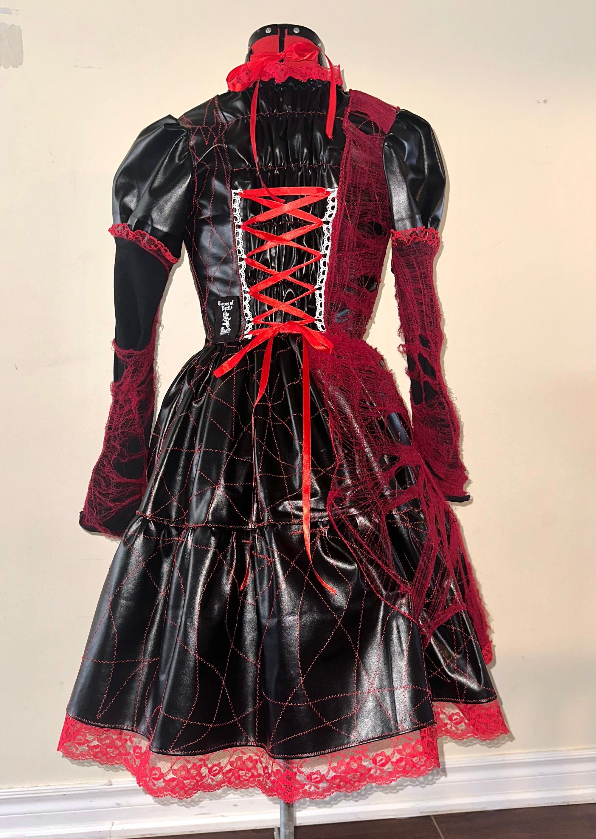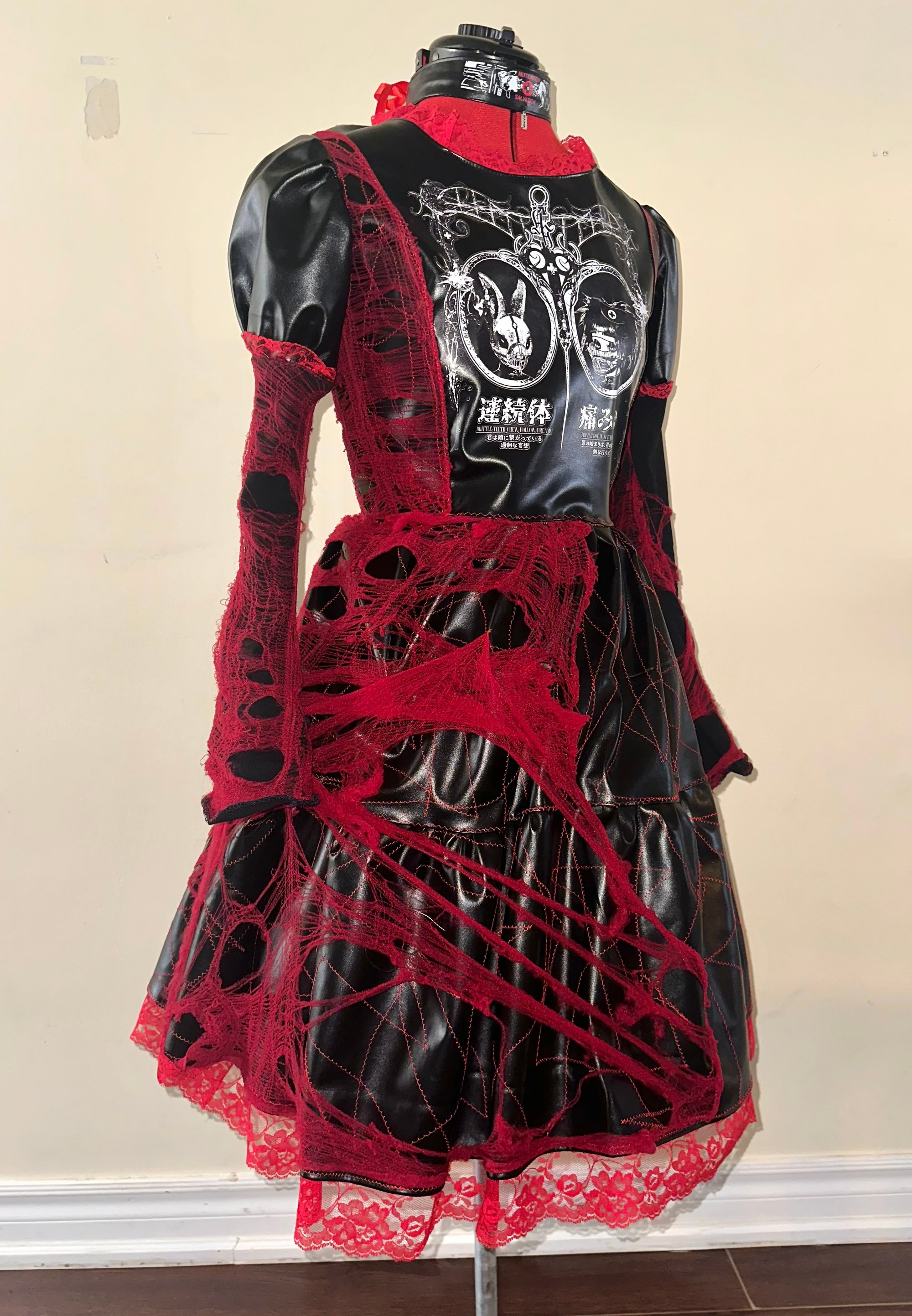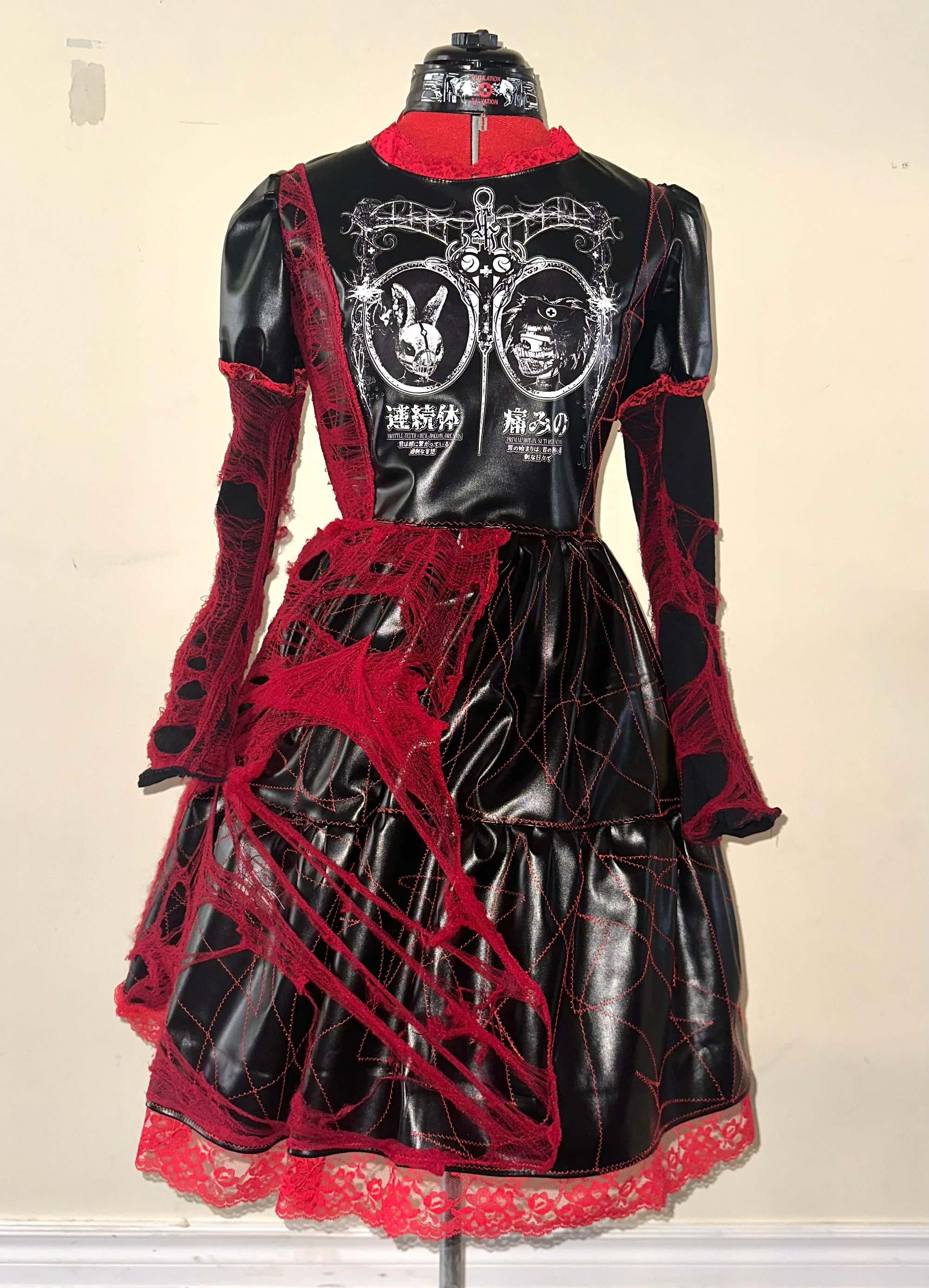 From the “Angel Autopsy” collection; black leather OP with soft black knit sleeves, red lace trim, distressed red knit jersey, back shirring + corset lacing, and a matching leather choker. Featuring original art and graphics by @crucifx0n.me