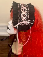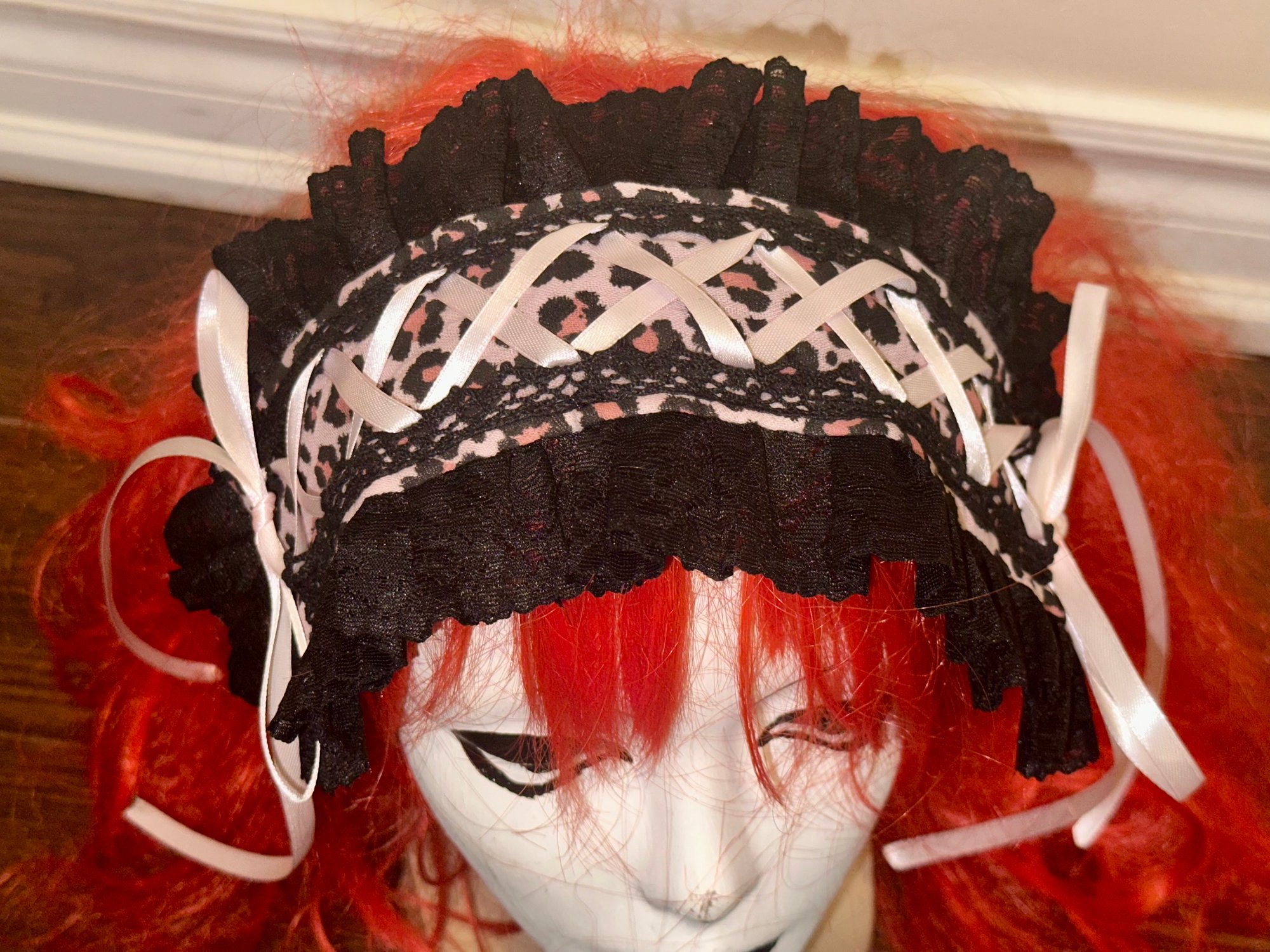 headdress made with light pink leopard print cotton gauze fabric, black stretch lace, black eyelet lace, and light pink/black ribbon.