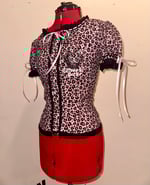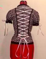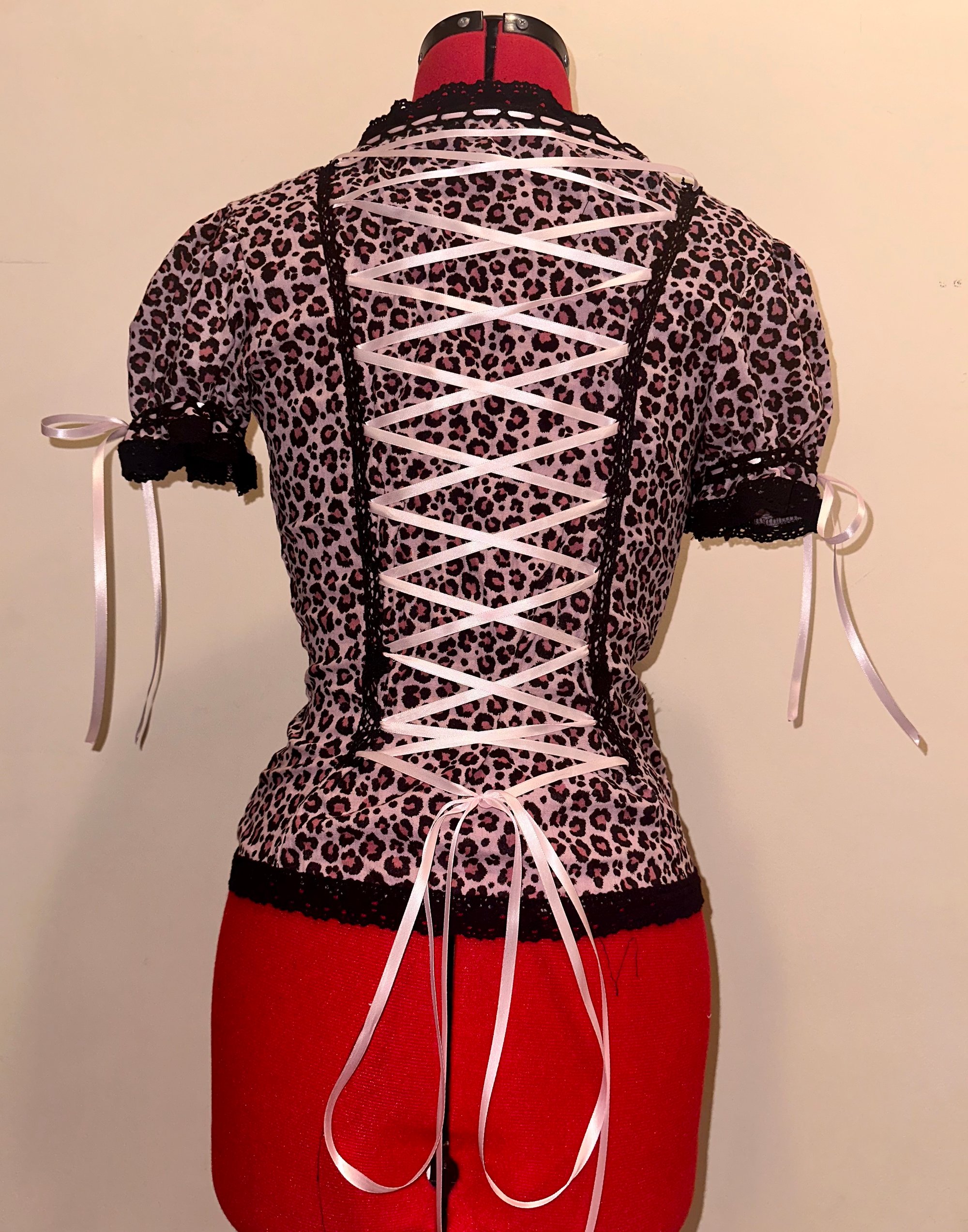 light pink cotton gauze blouse with hidden button tape trim, black lace, light pink ribbon, back corset lacing, and original logo design.
