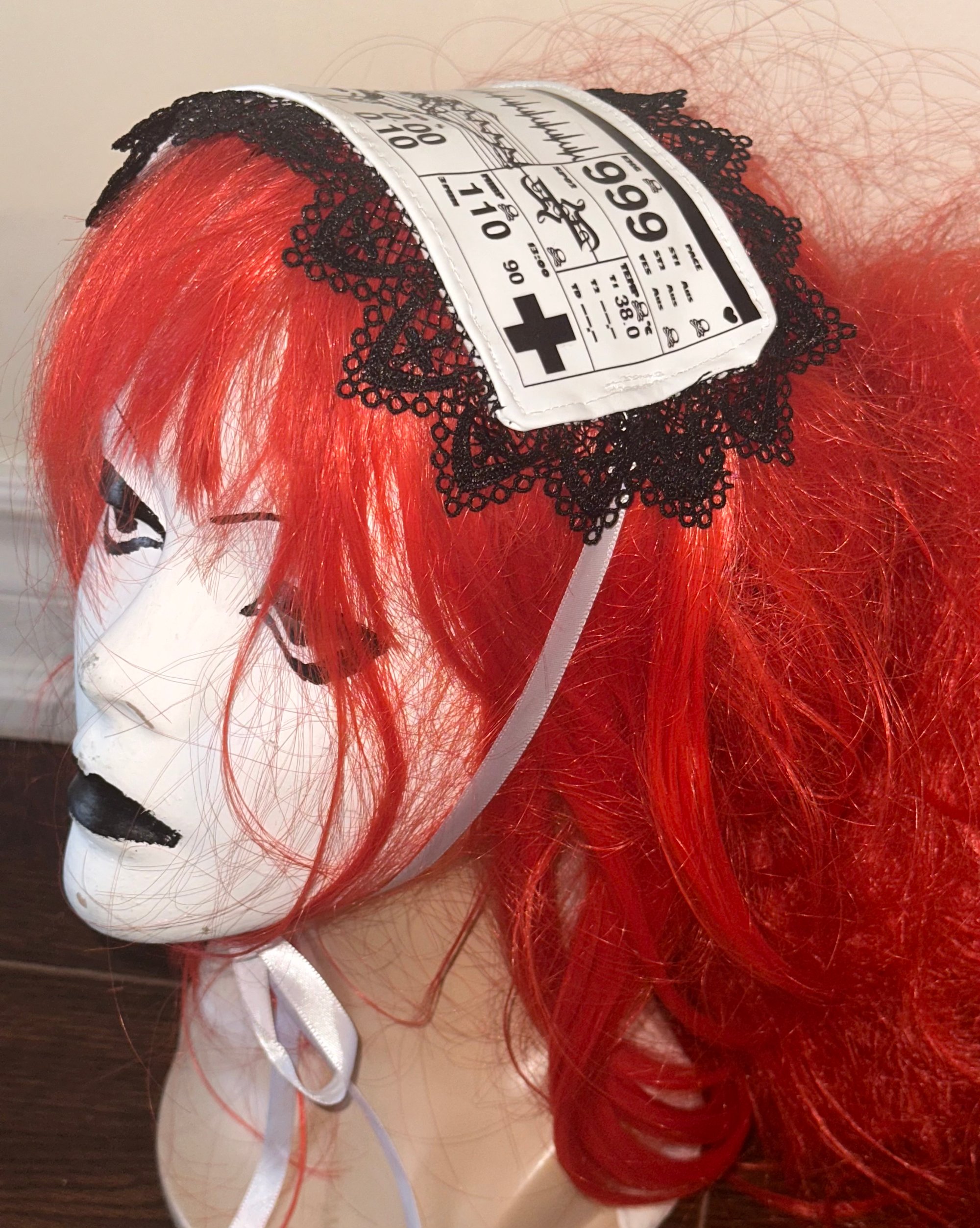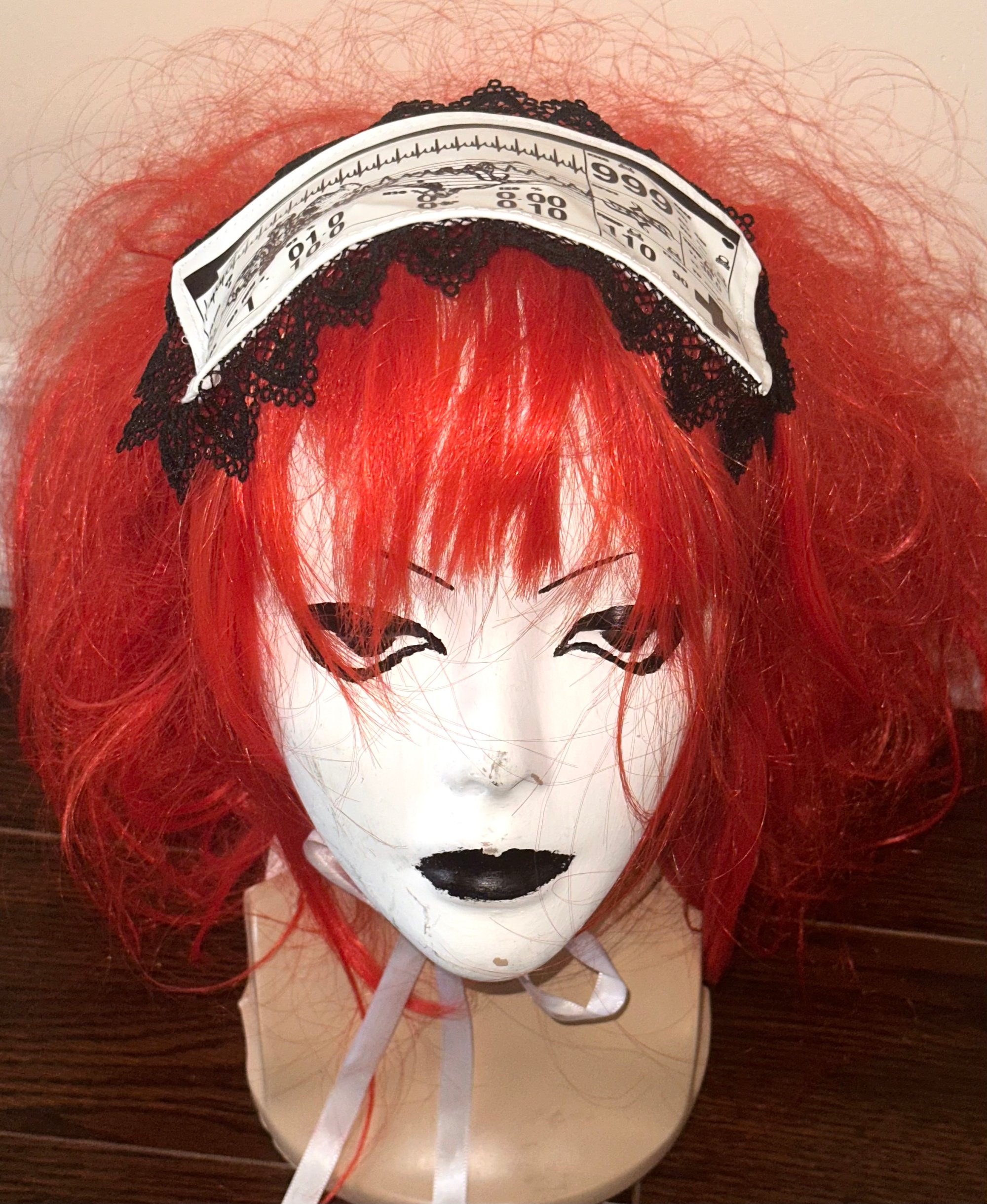 From the “Angel Autopsy” collection; soft white PVC headdress with black lace featuring original medical monitor graphic by @crucifx0n.me