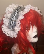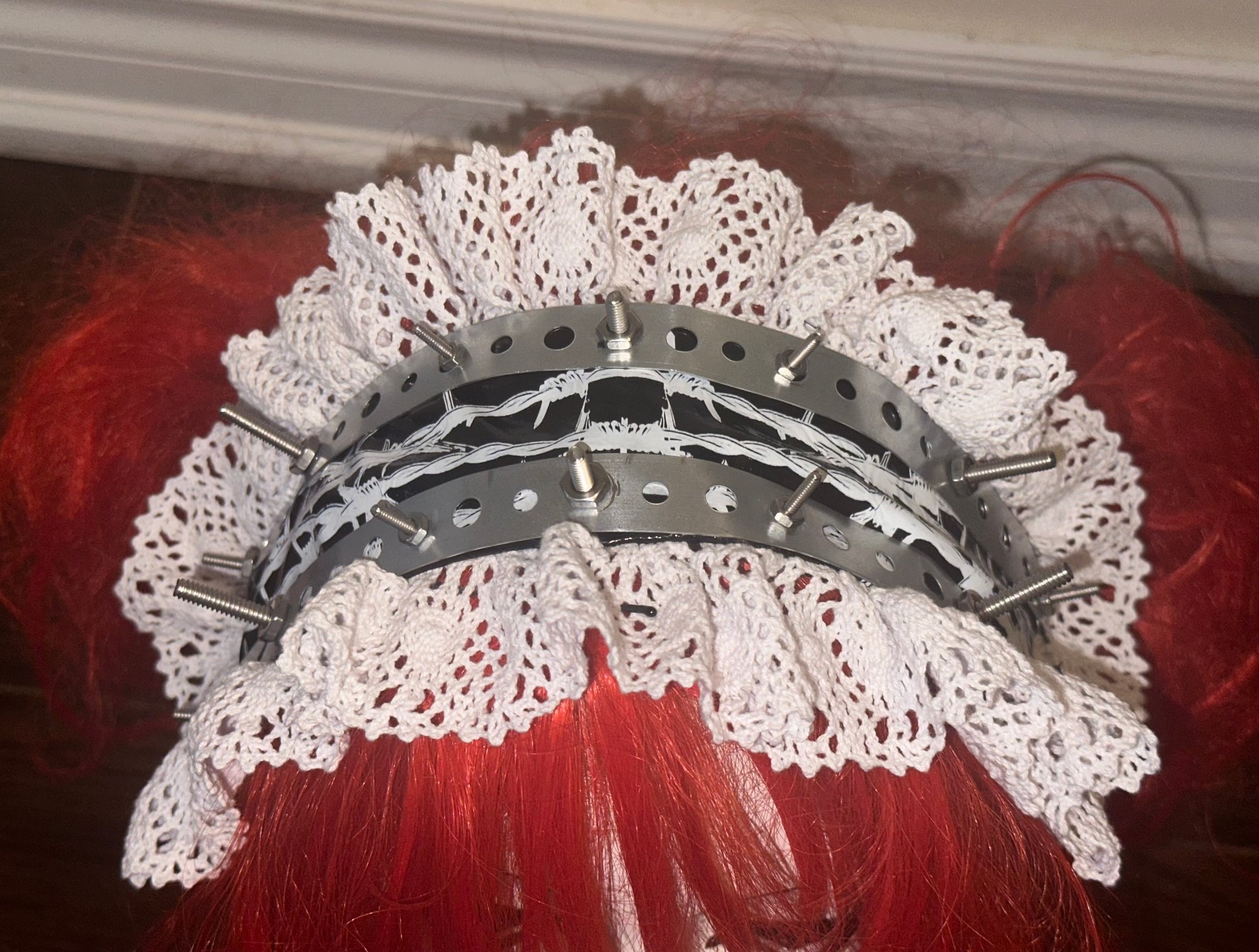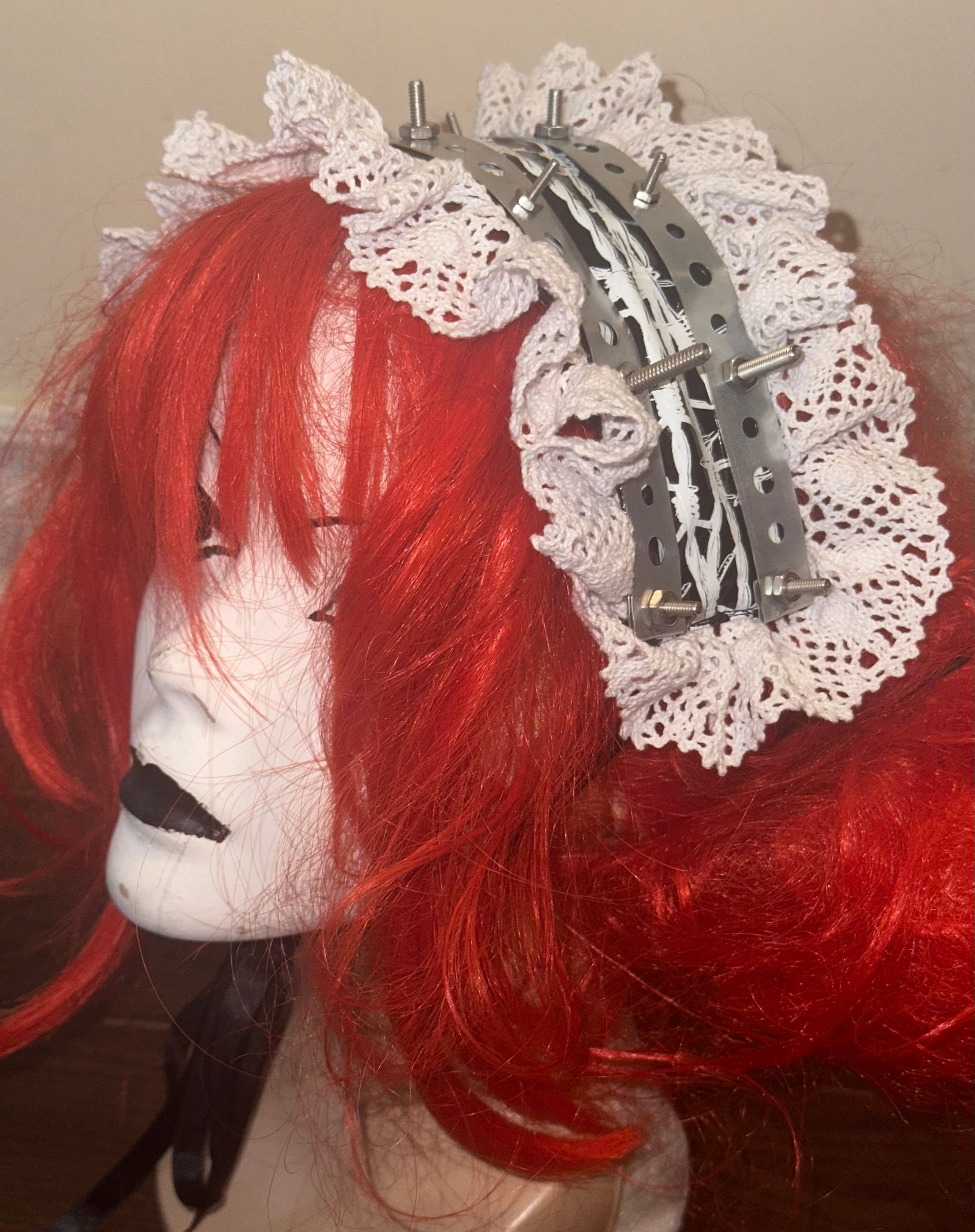 black pvc headdress structured with metal plumbers tape; features barbed wire graphic, screws, and lace detailing