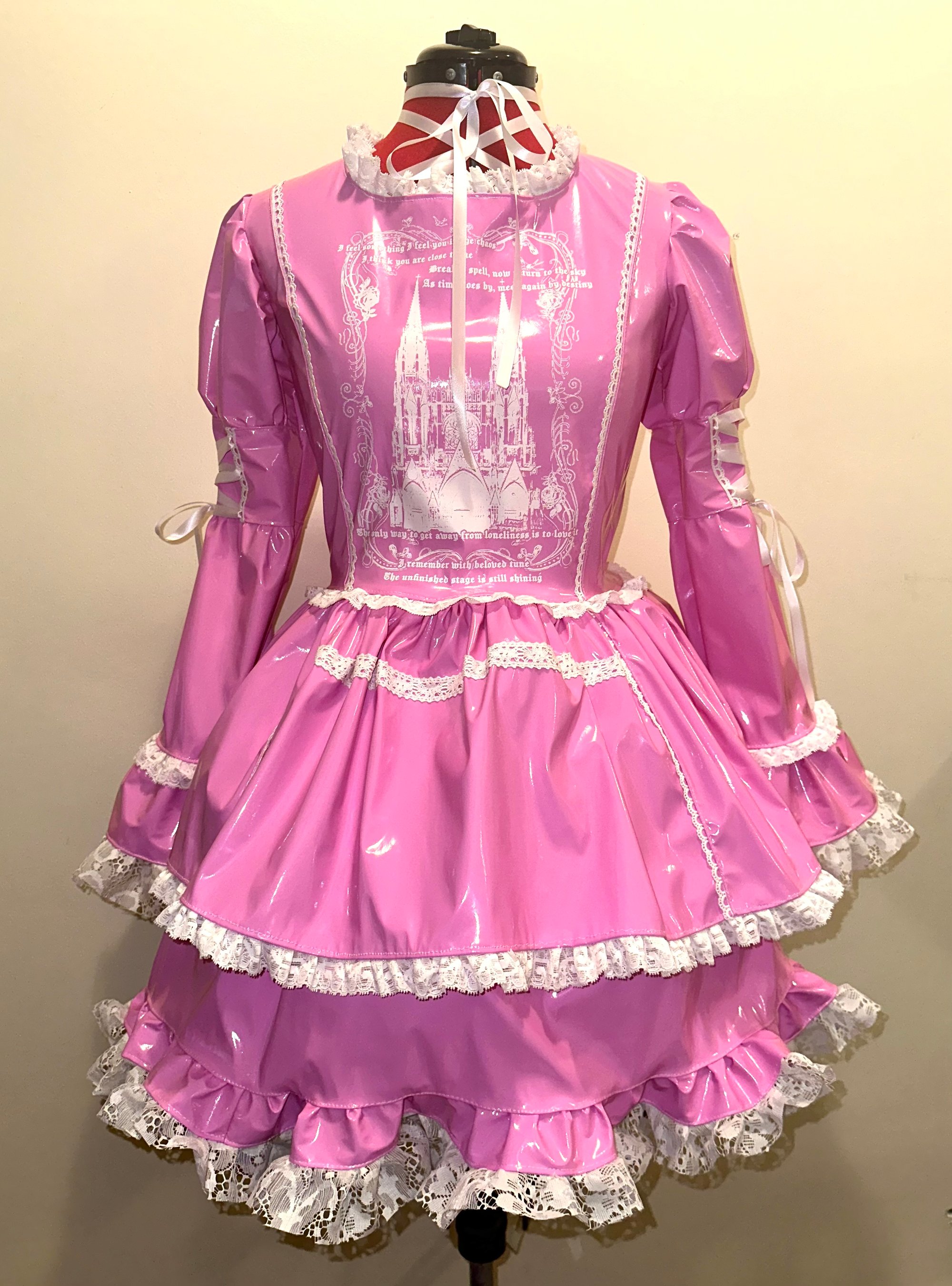 PVC “monophobia” print OP in a princess-style cut + matching headdress; perfect for a sweet lolita coord with a bit of a twist! includes back shirring + corset lacing, as well as corset lacing at the bicep