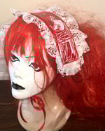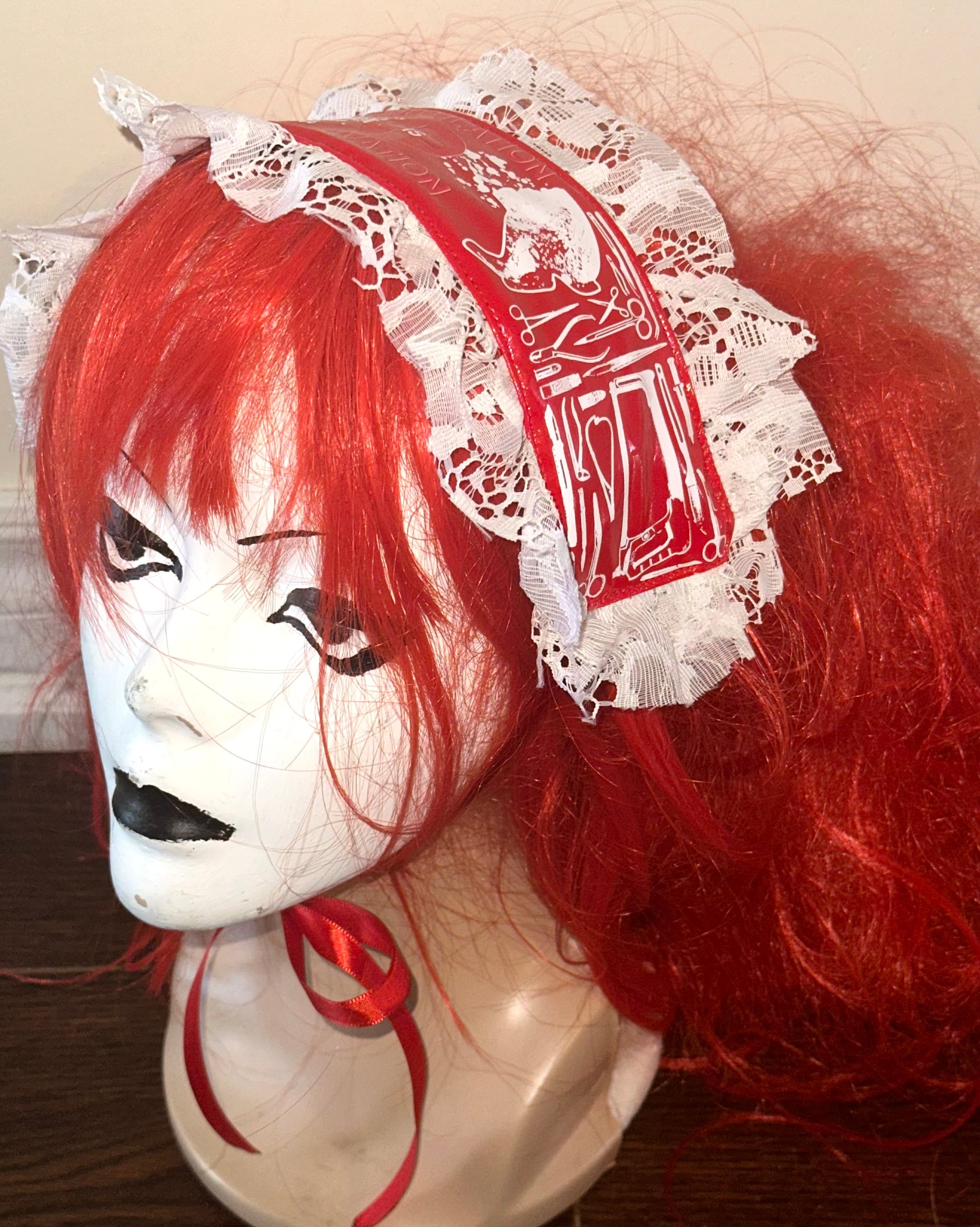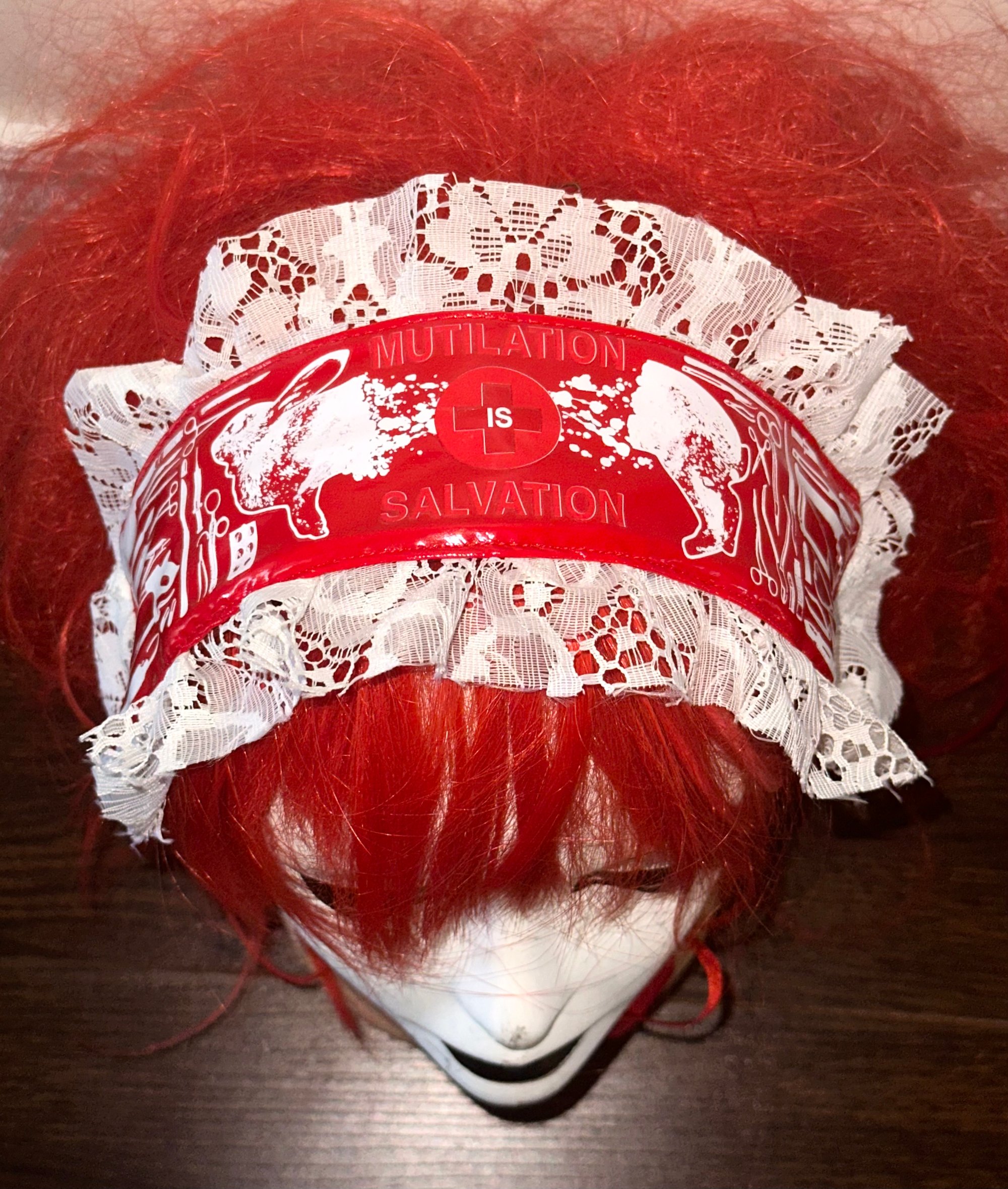 From the “Angel Autopsy” collection; soft red PVC headdress with white lace featuring "Mutilation is Salvation" graphic by @crucifx0n.me