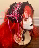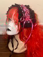 headdress made with pink leopard print velvet fabric, black stretch lace, black eyelet lace, and hot pink/black ribbon.