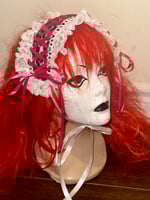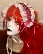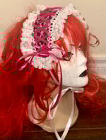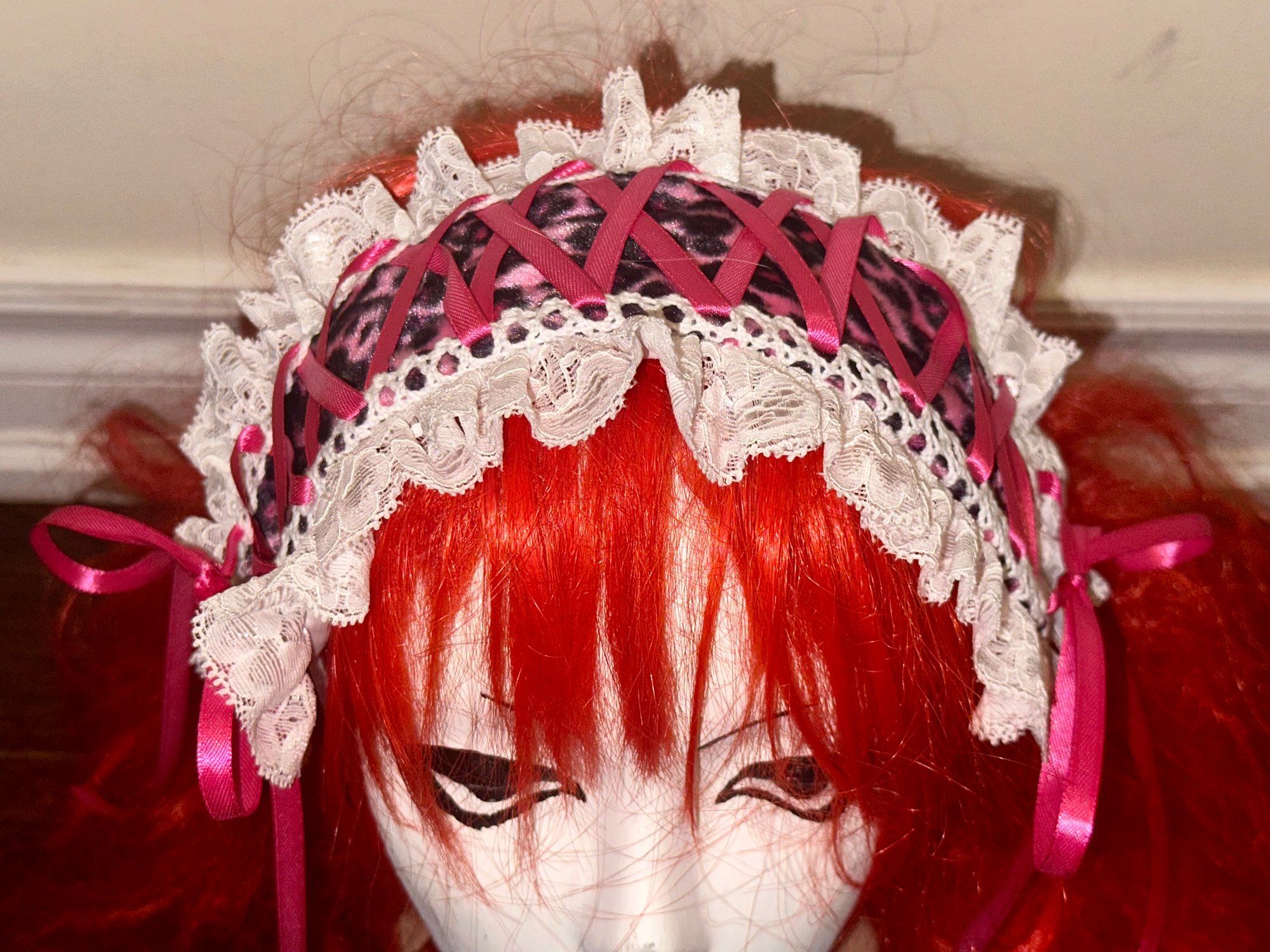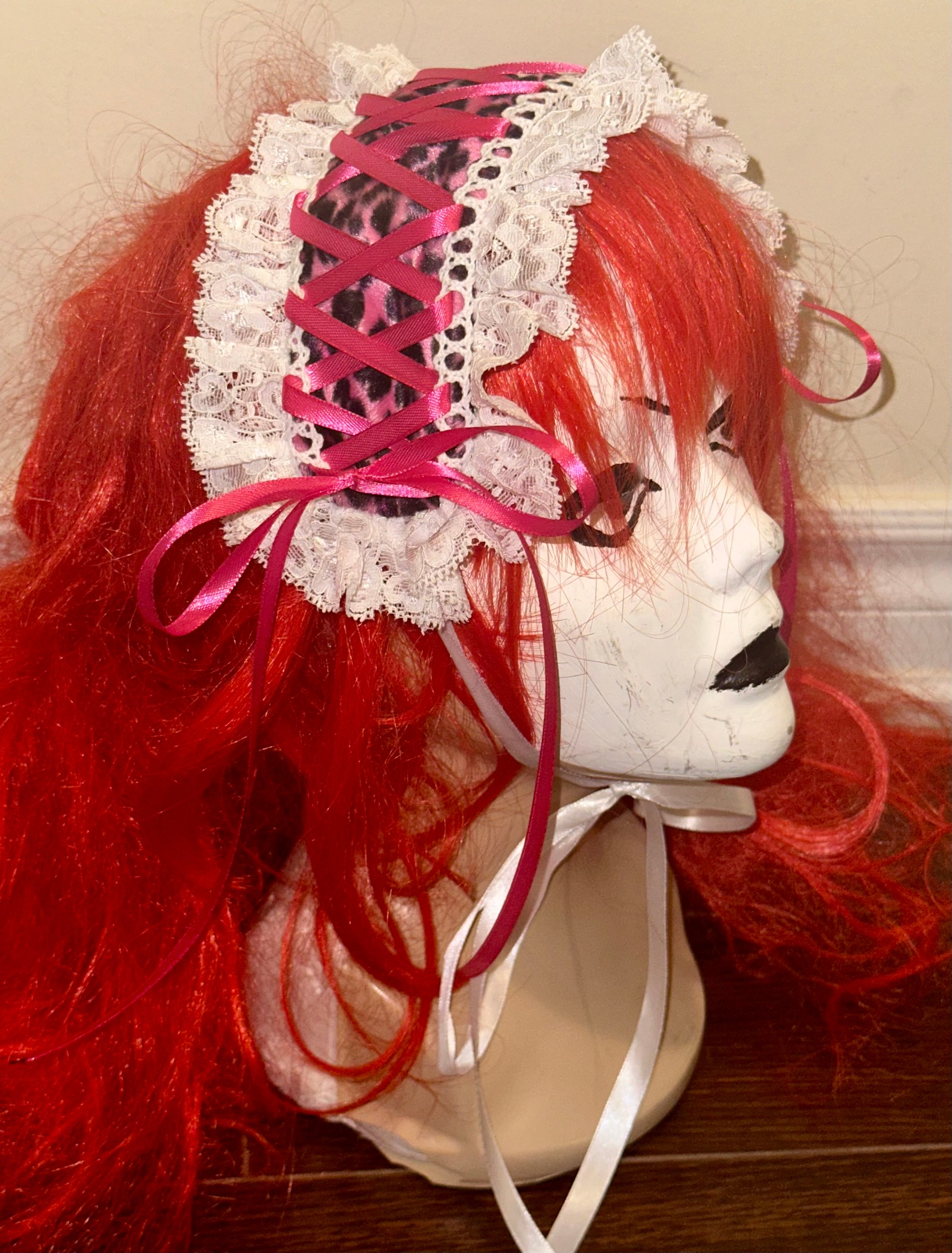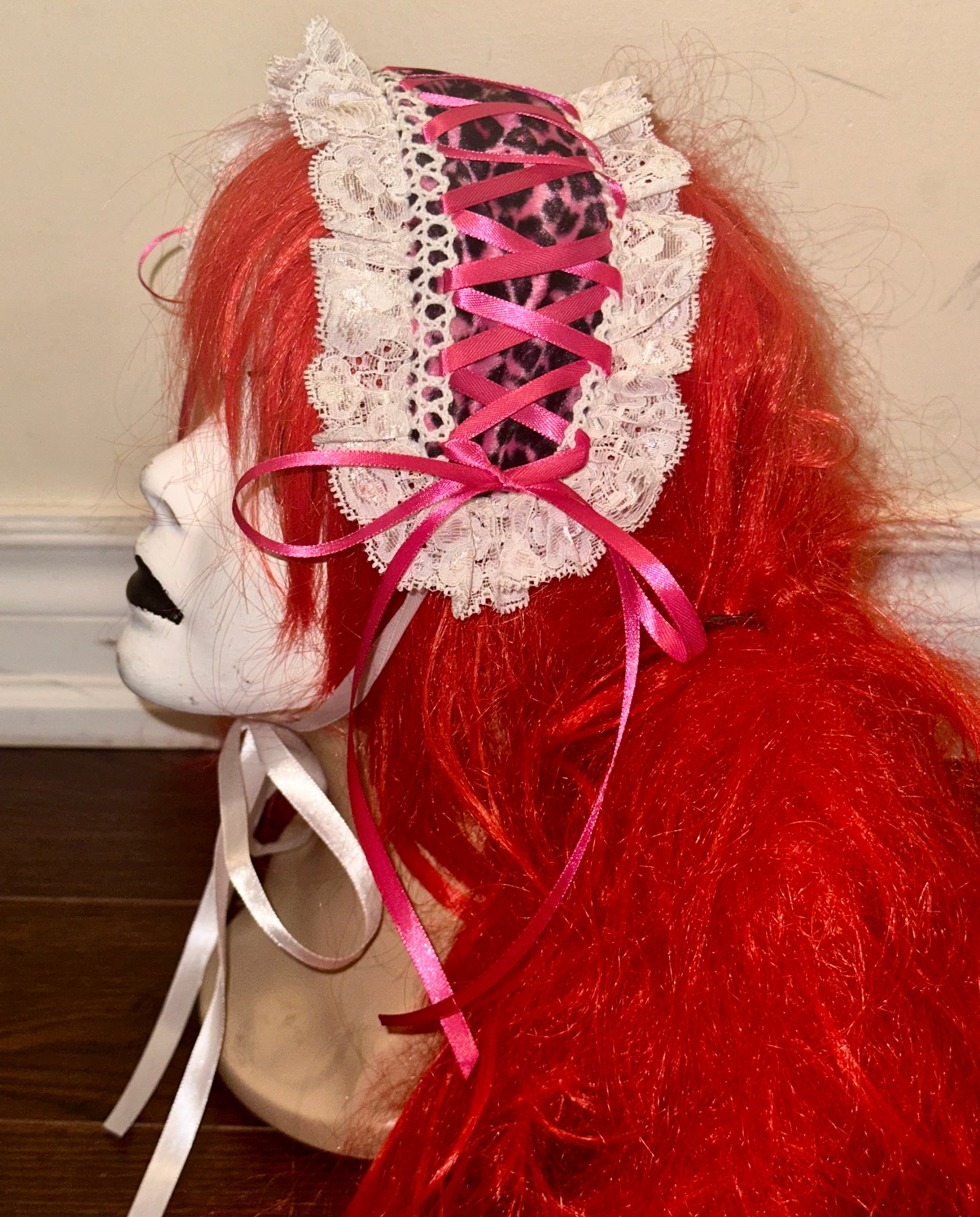 headdress made with pink leopard print velvet fabric, white stretch lace, white eyelet lace, and hot pink/white ribbon.