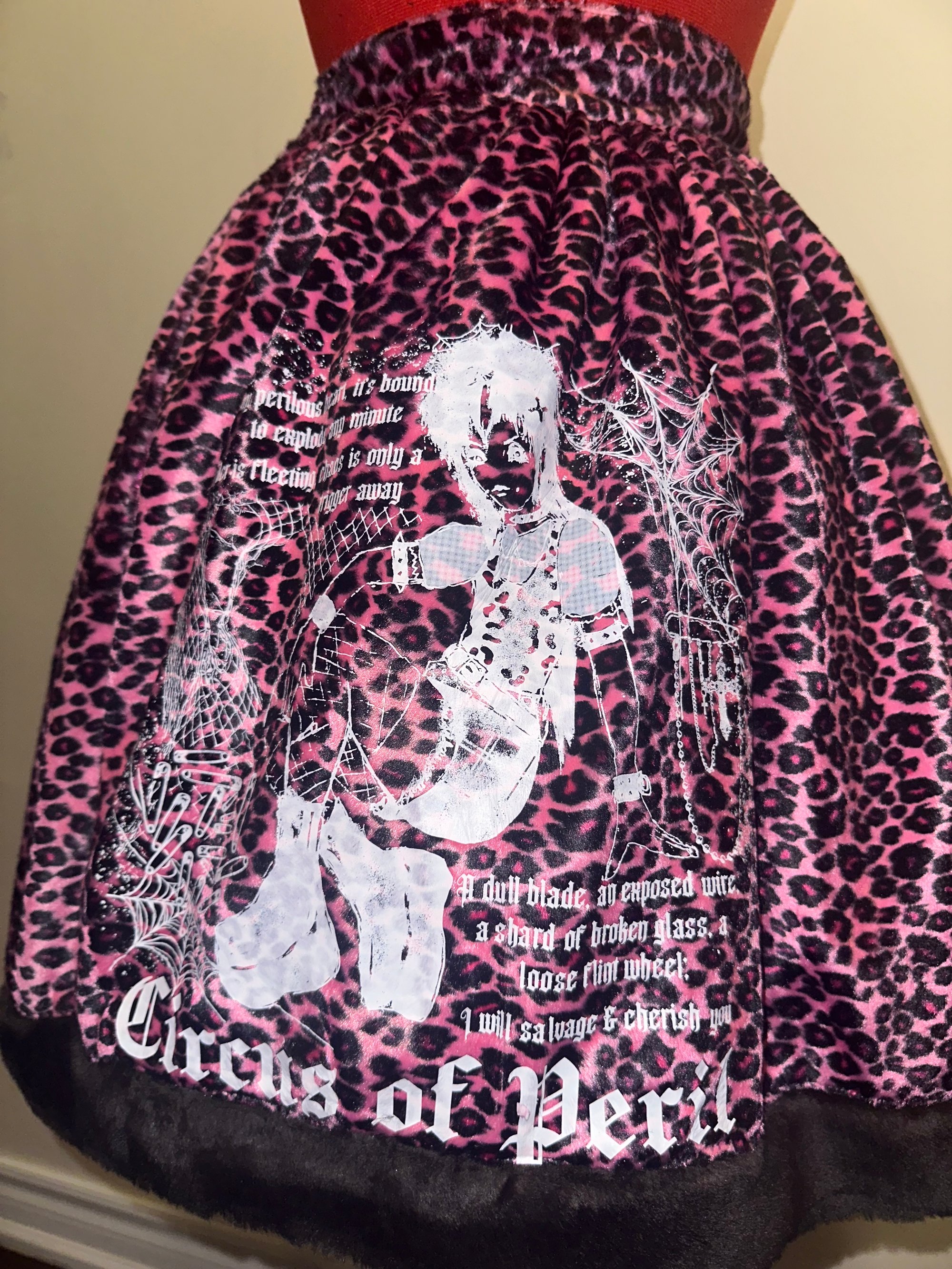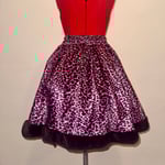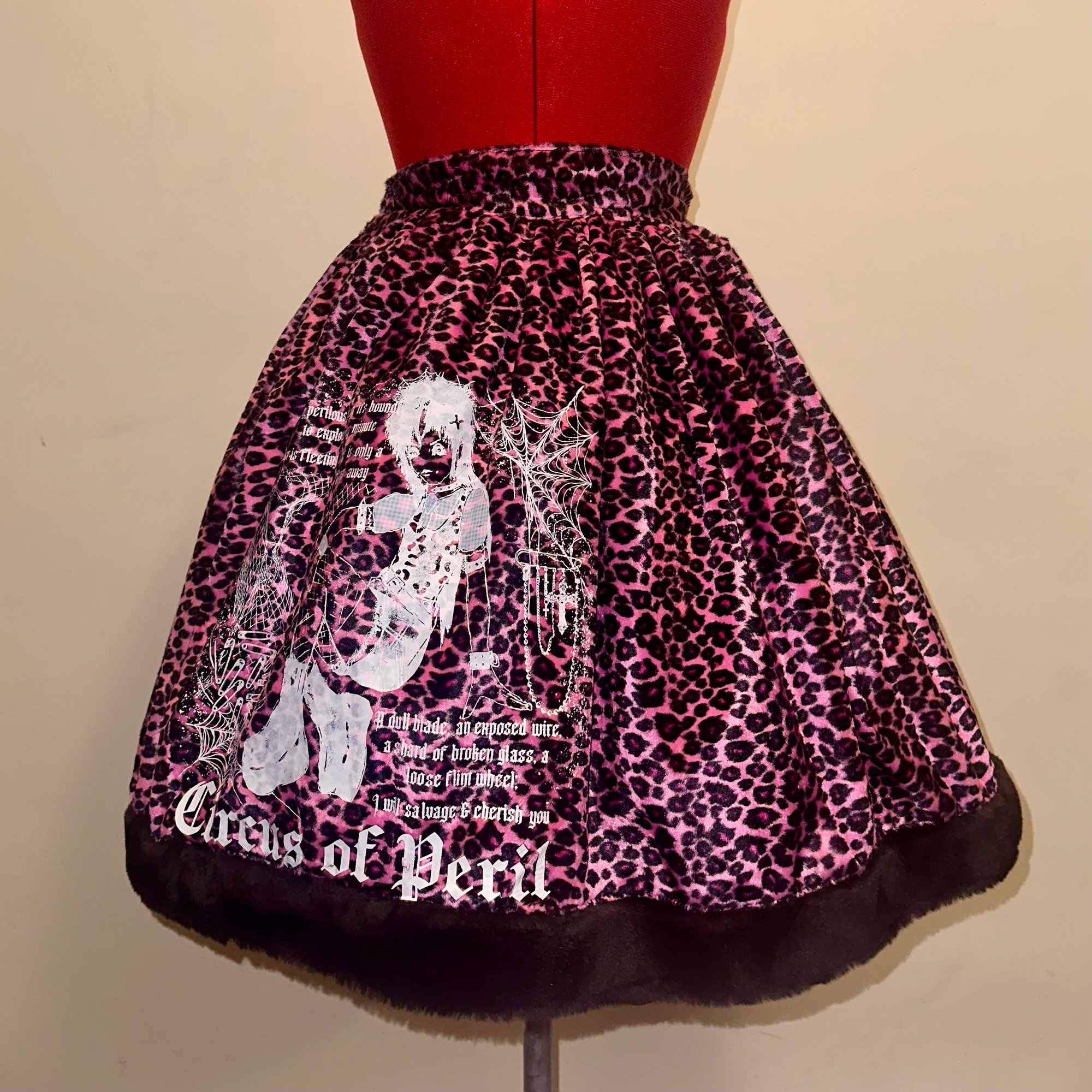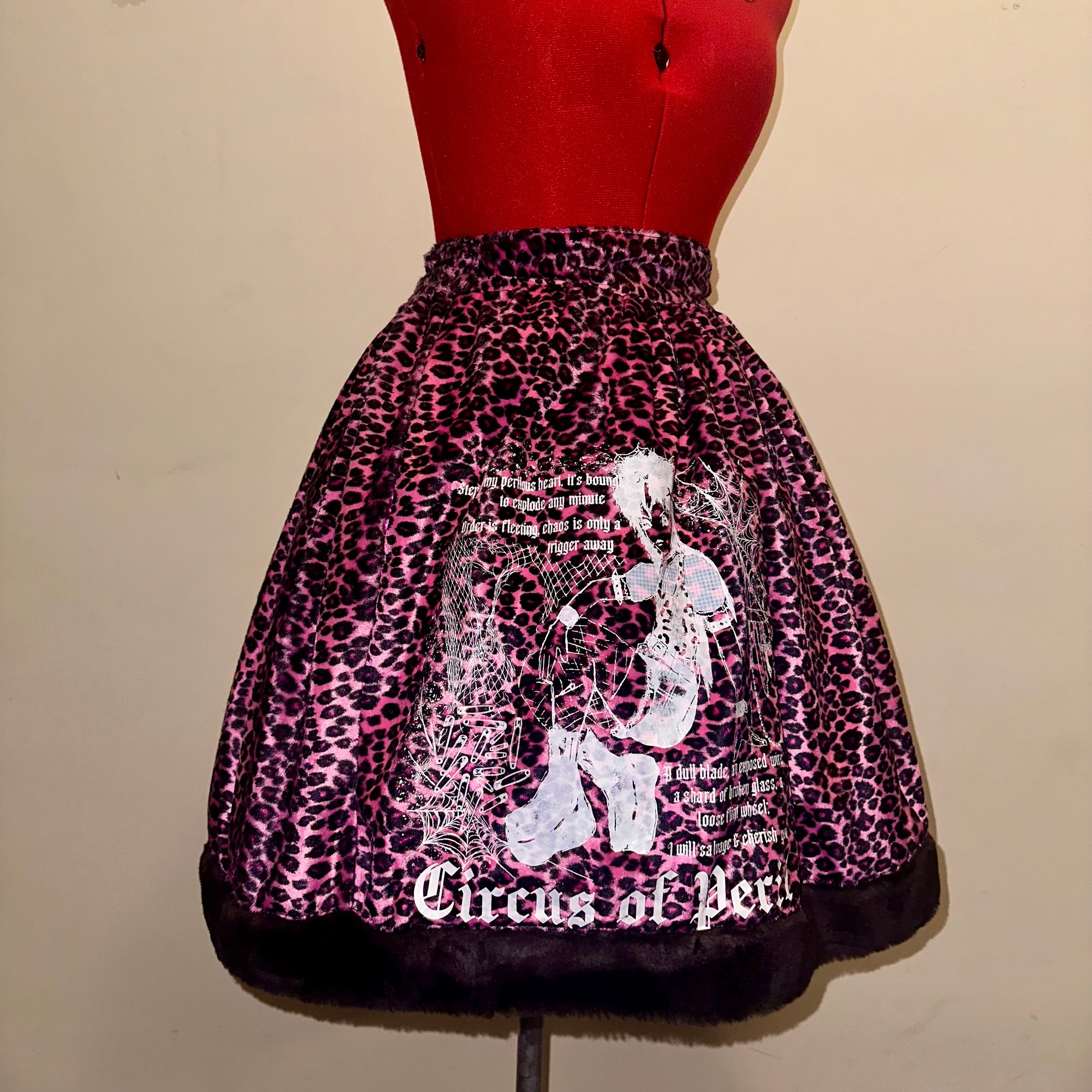 pink leopard print velvet skirt with back shirring, featuring black faux fur trim, hidden side seam pockets, and original "perilous heart" print design.