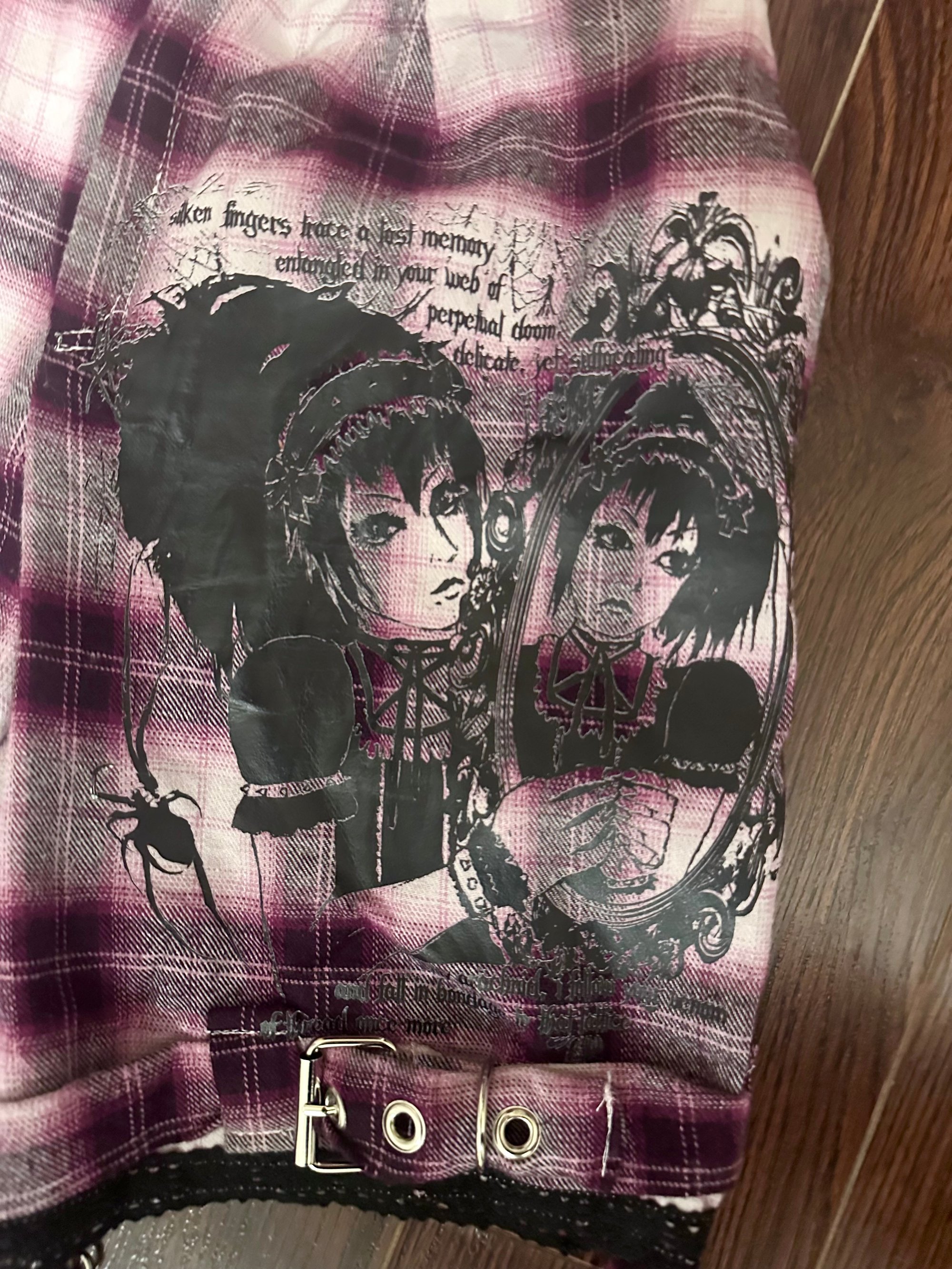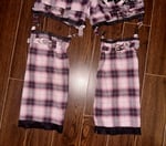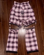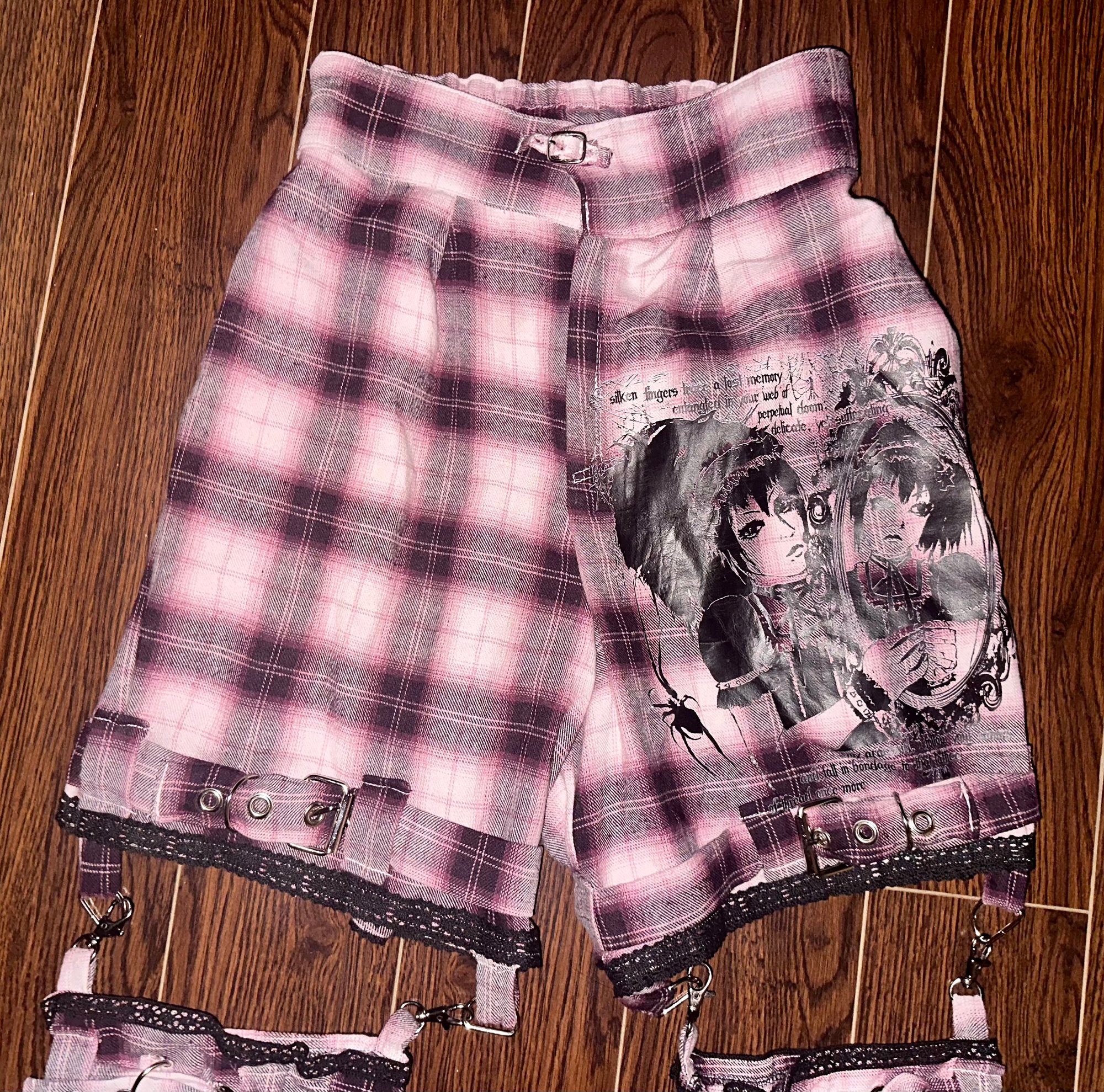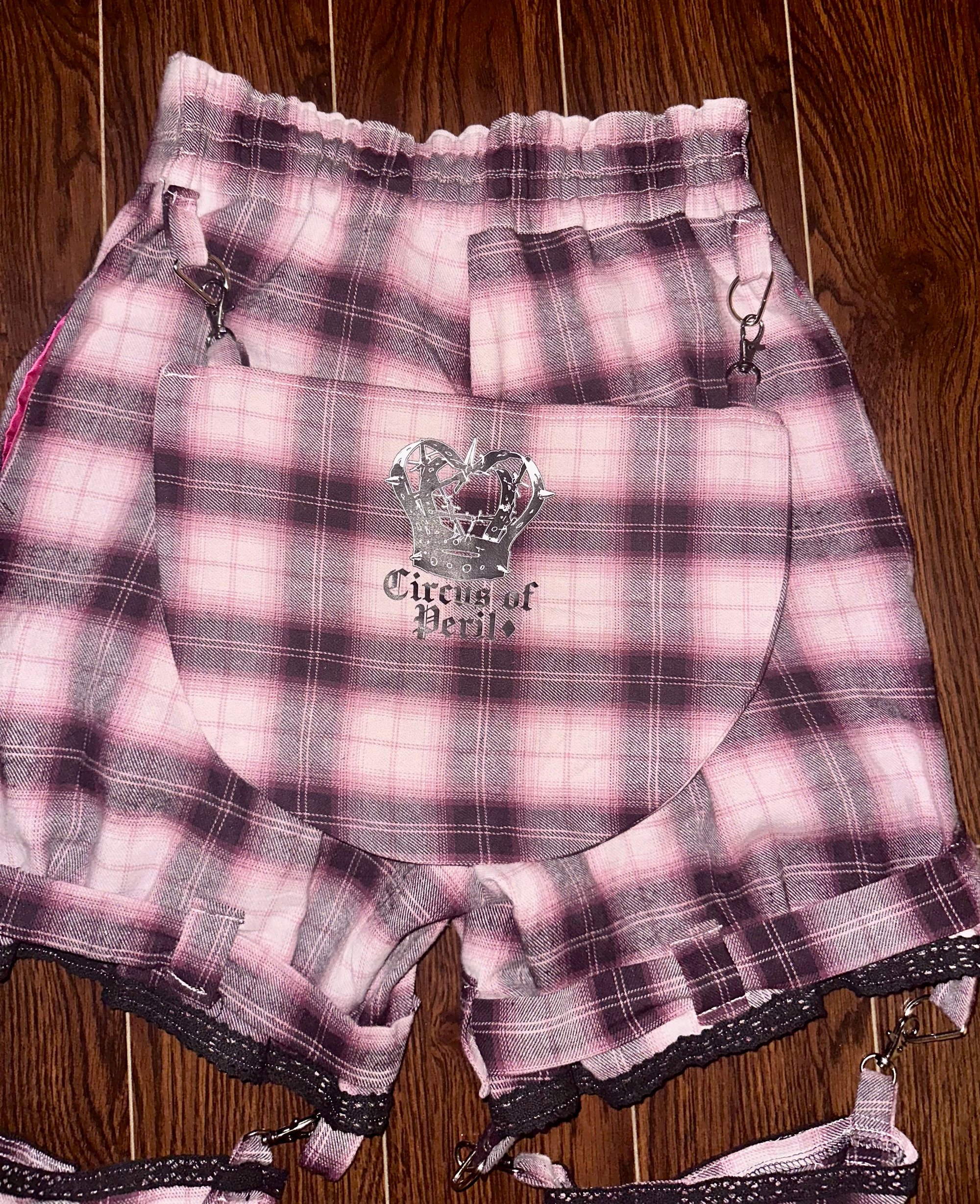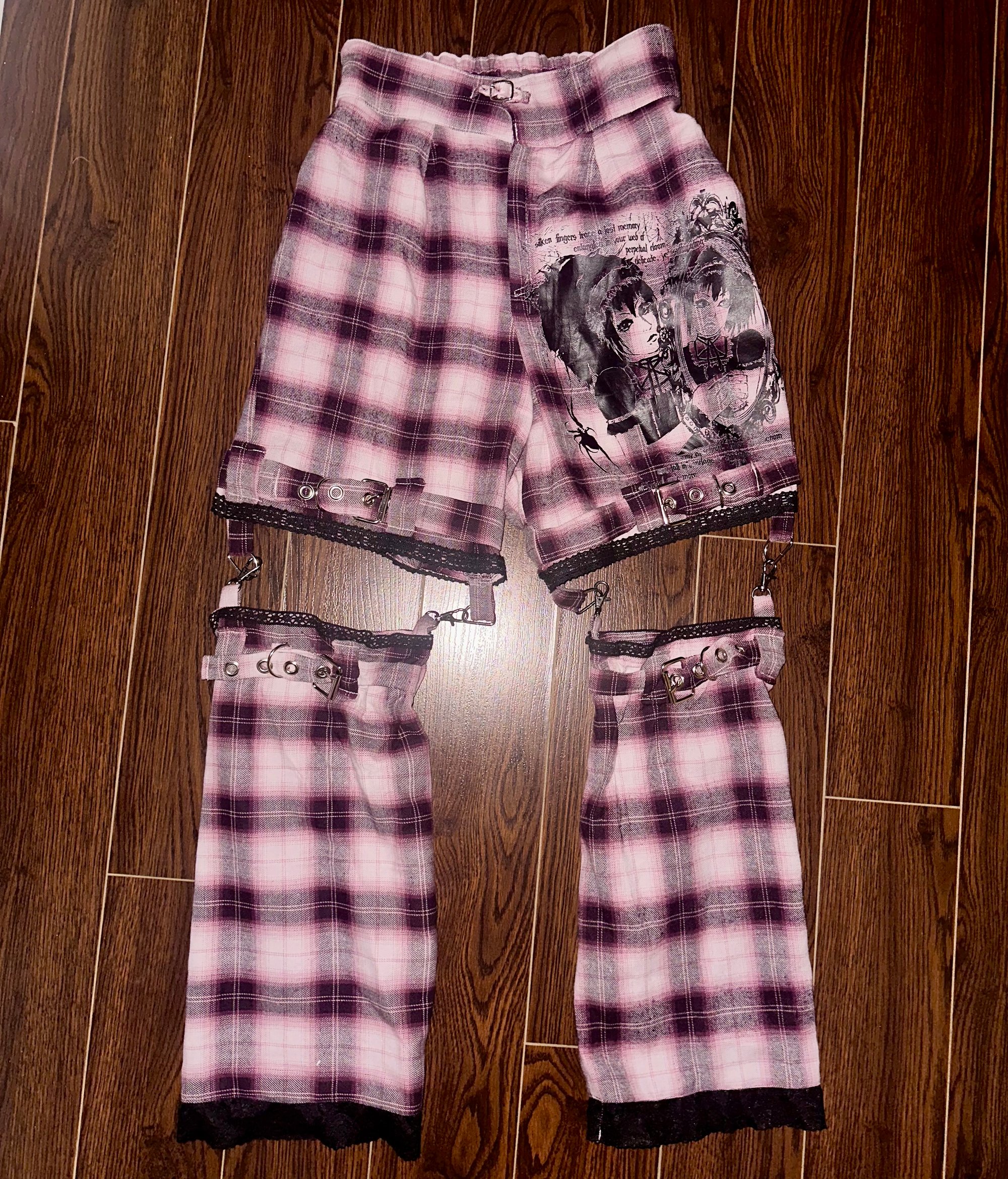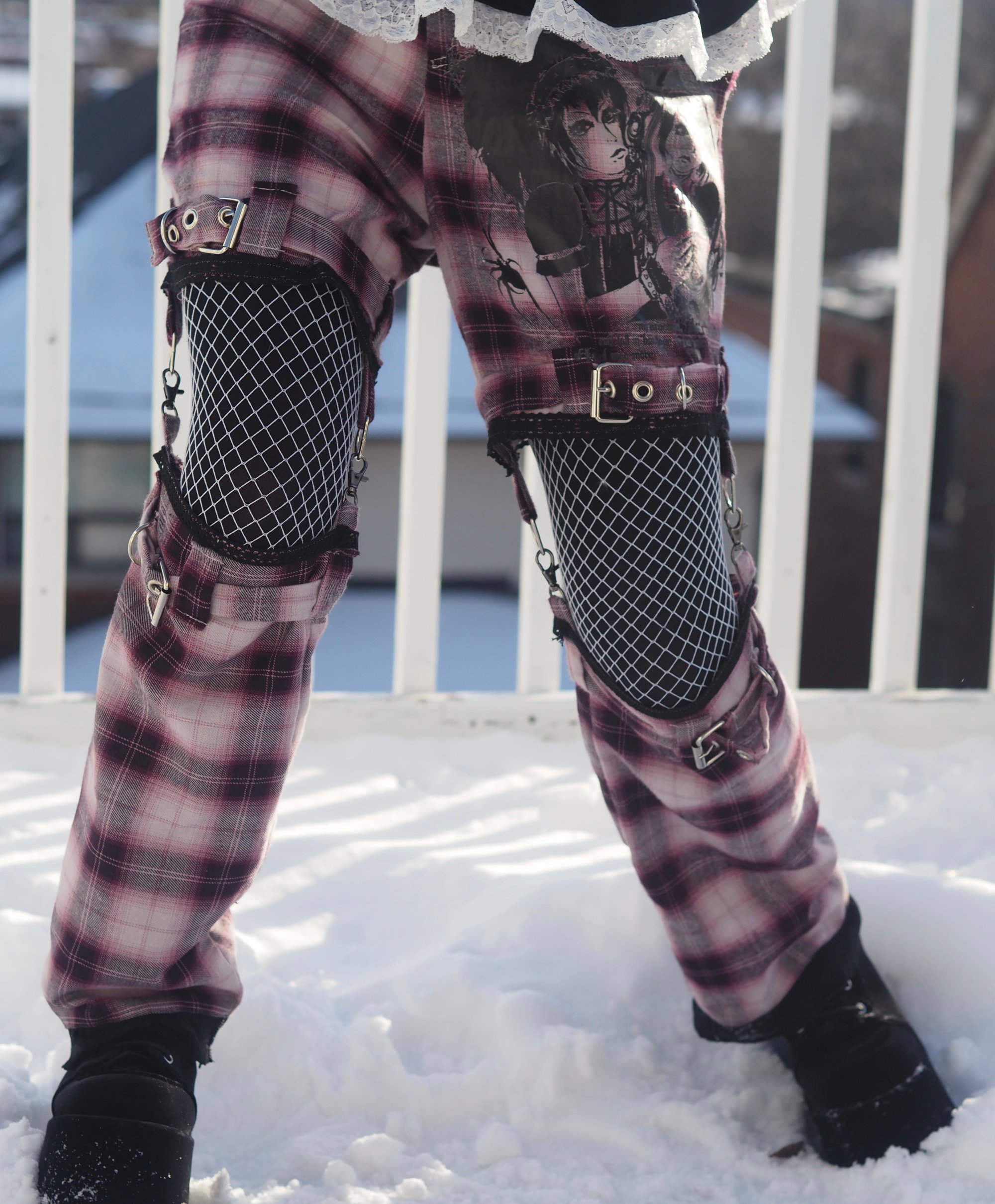 pink plaid cotton bondage pants with back waist shirring, featuring detachable leg warmers/bum flap, hidden side seam pockets, buckles, black laces, and original "arachnid" print design.