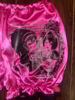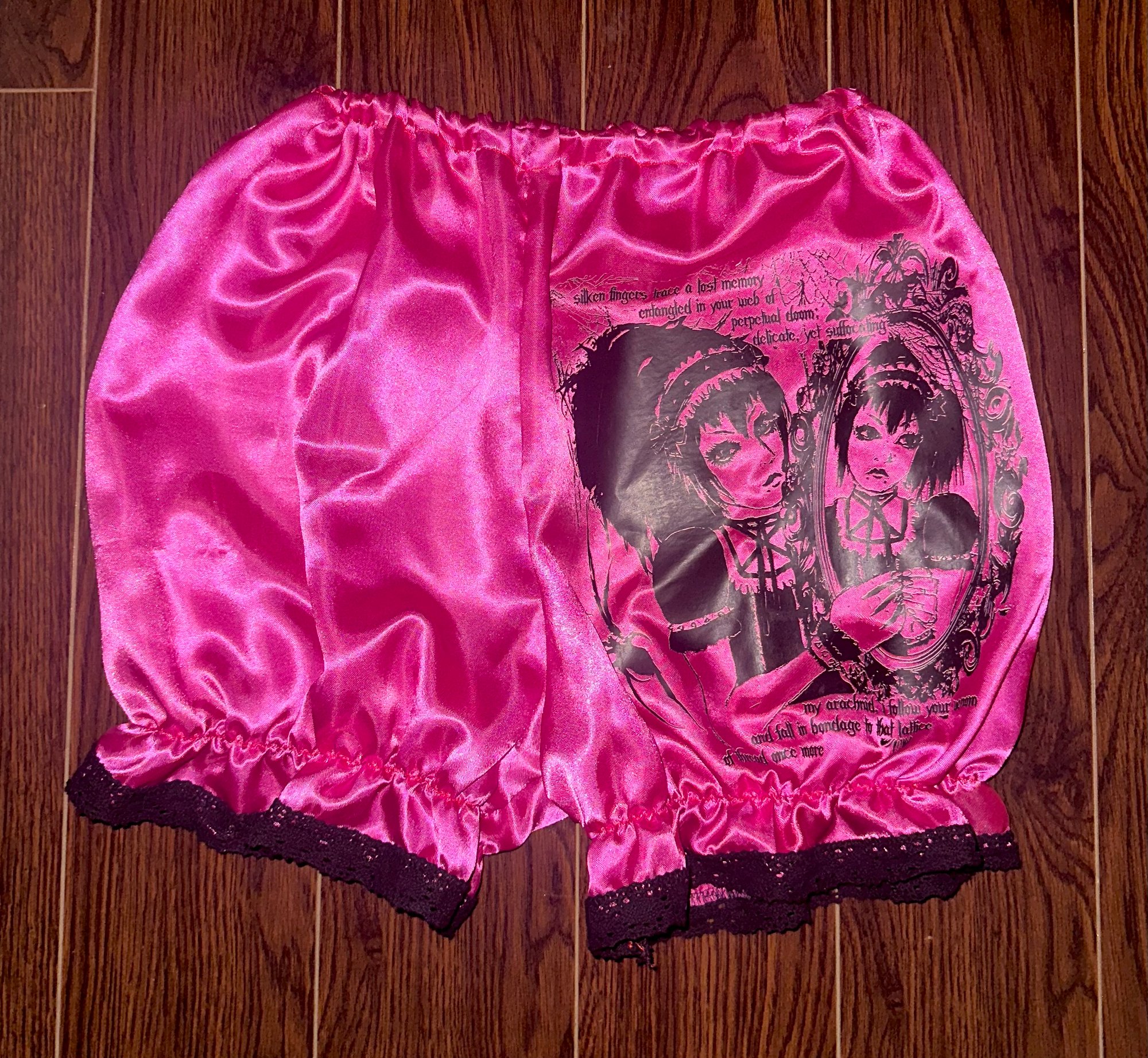 hot pink satin bloomers with black lace, featuring original "arachnid" print design.