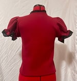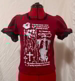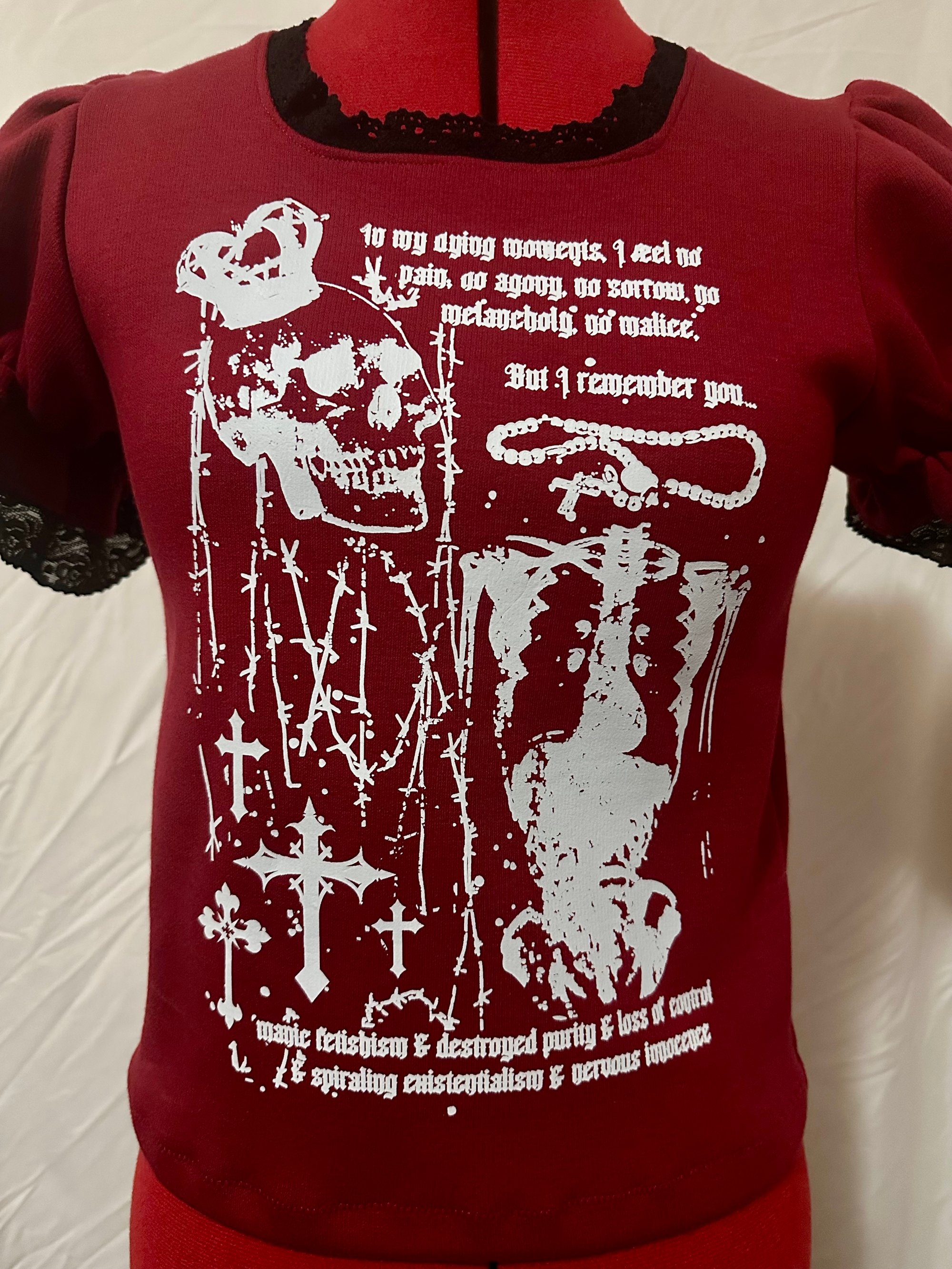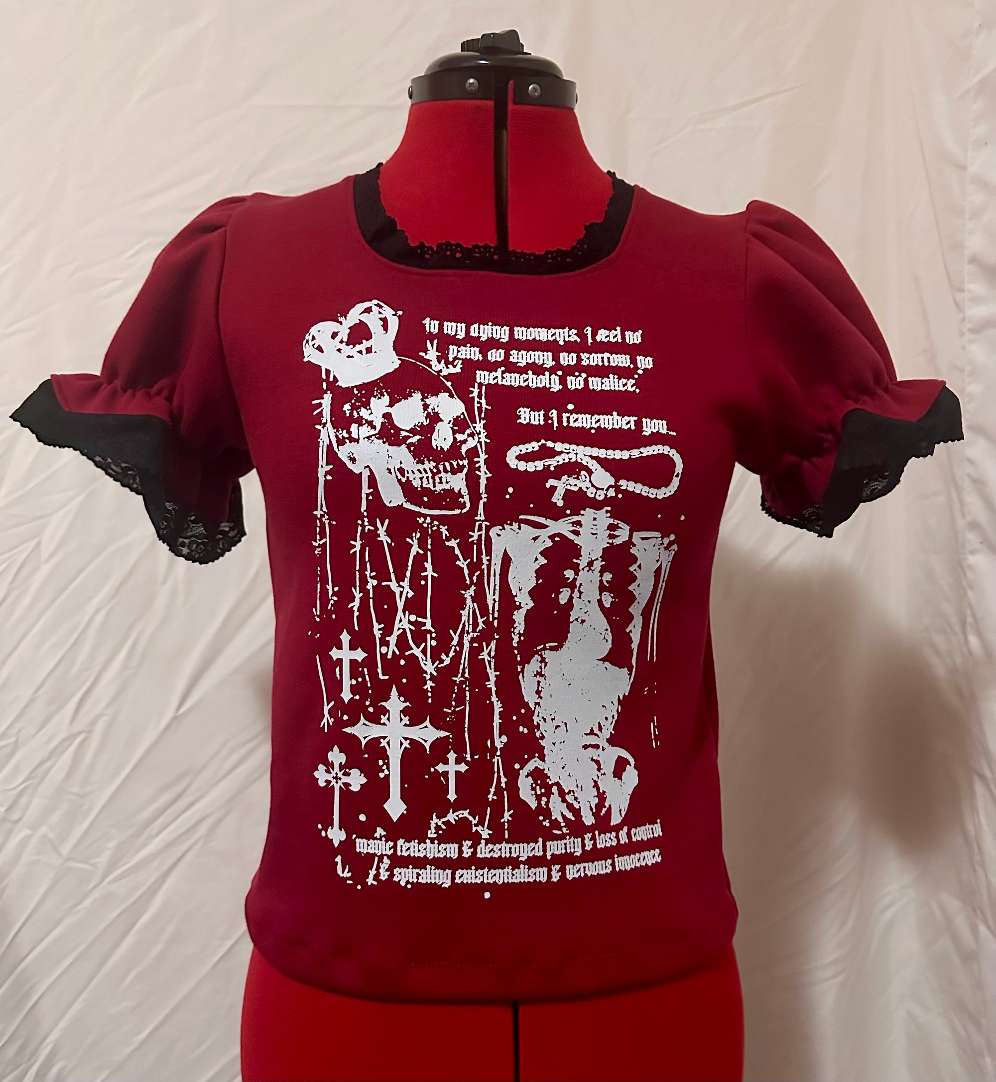 short sleeve cutsew made from red cotton jersey fabric and black stretch + cotton lace, featuring skull graphic