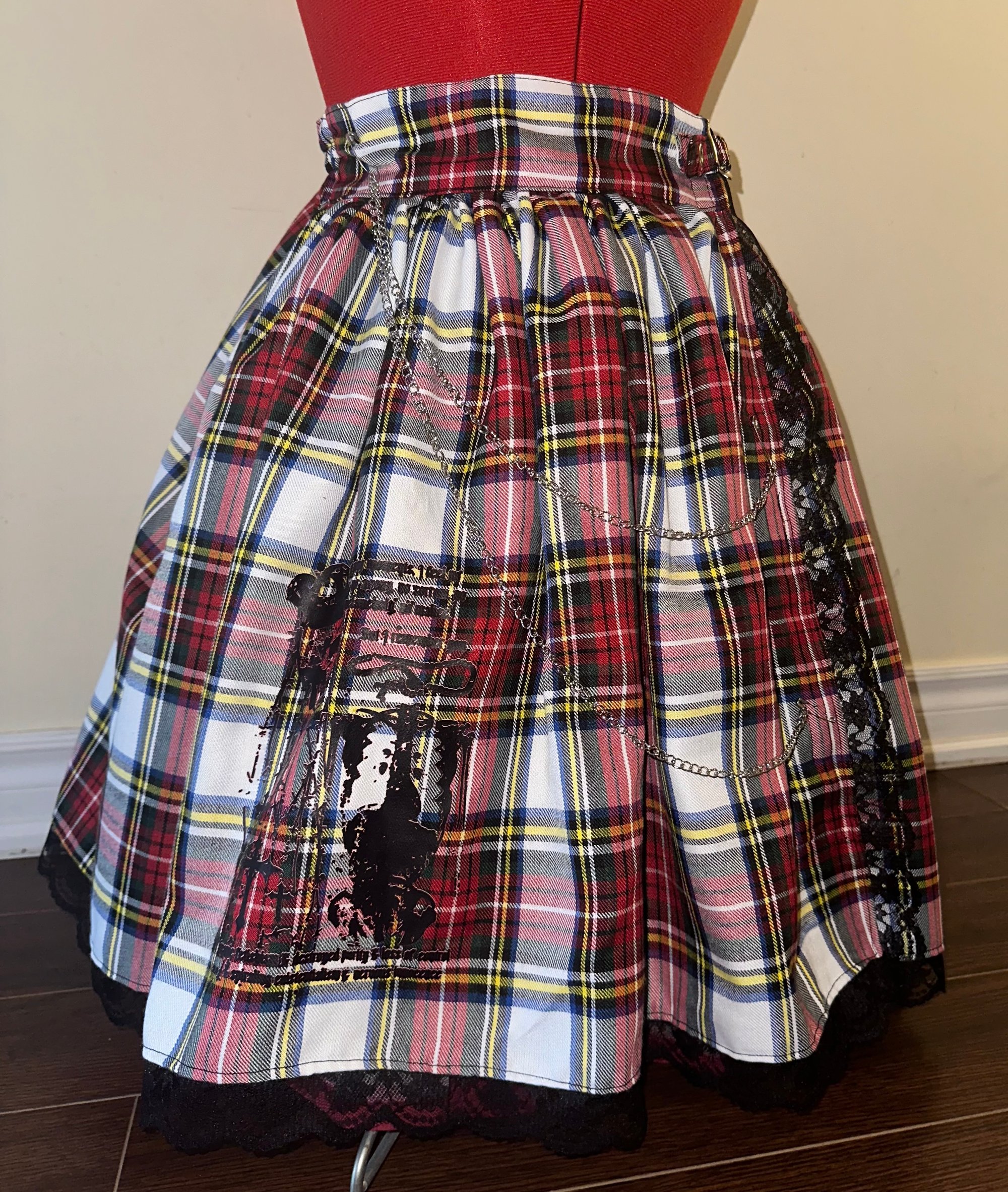 tartan skirt in a punky style with an original skull print design, detachable chains, waist buckle, & hidden side buttons. includes back shirring.