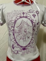 short sleeve cutsew made from white cotton jersey fabric and purple lace, featuring cobweb graphic